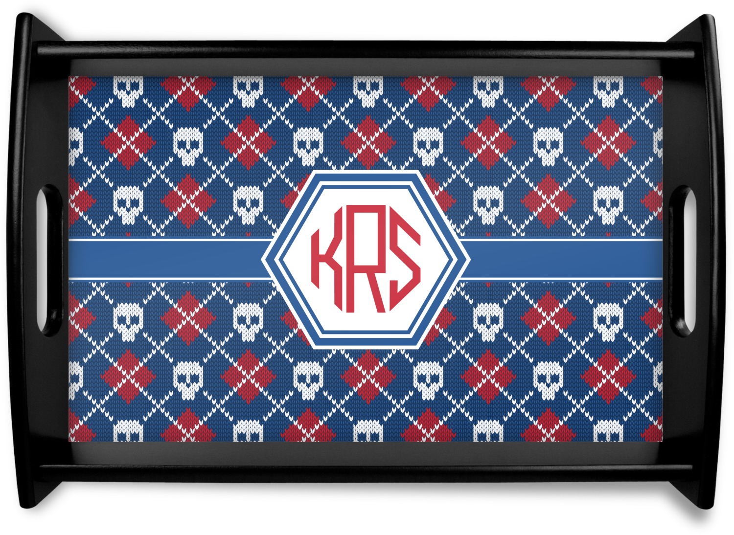This serving tray with handles features square edges and two rounded sides, creating a very modern look. Each side is fabricated from a beautifully cut, natural wood. The bottom of the interior of the tray displays your customized design in bright, vibrant color. The tray is sold in both a black color and a natural wood look. Each variation of the wood serving tray has two sizes: Small, which is 14" x 10" x 2.25", and Large, which is 19.5" x 13.5" x 2.75".