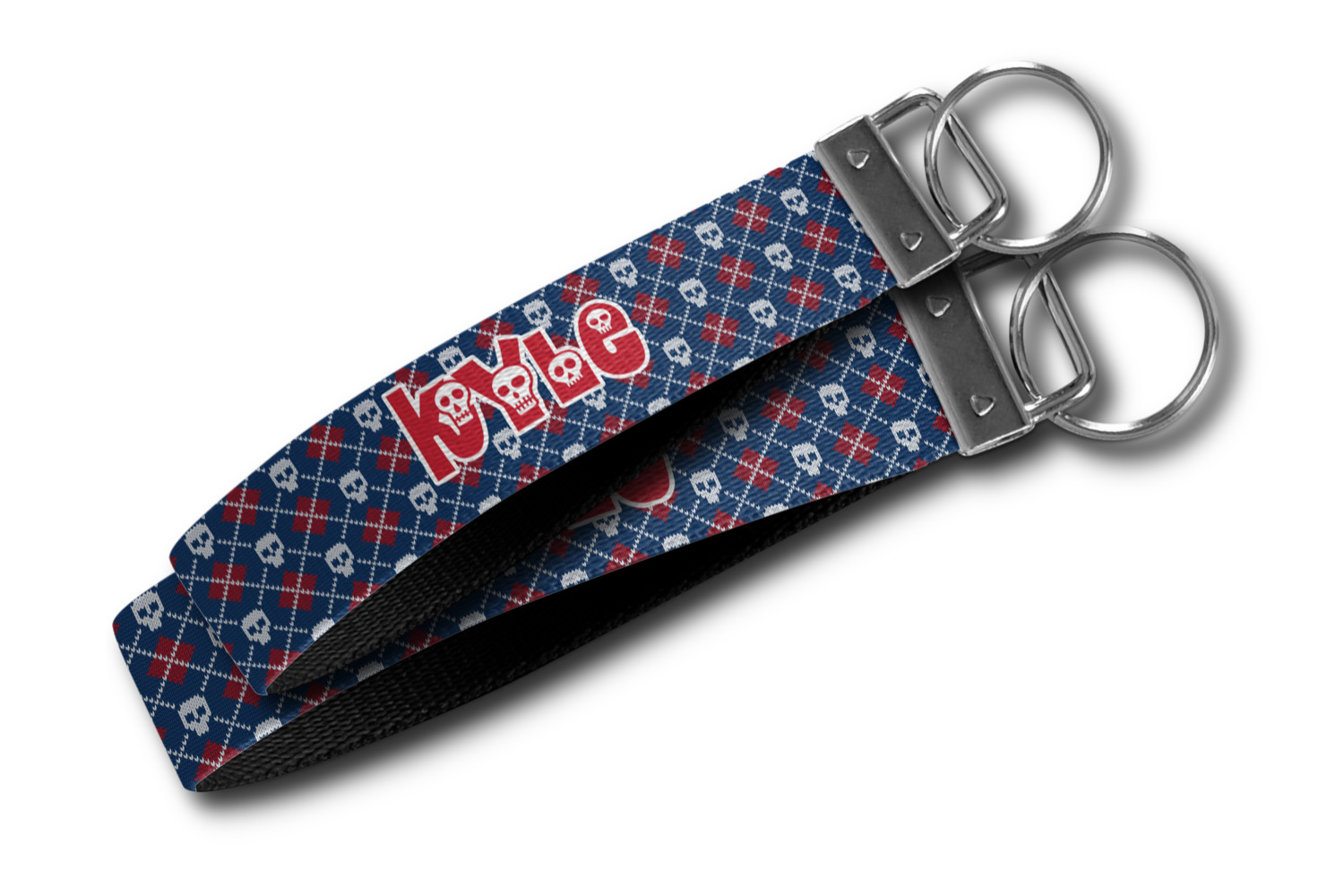 These key fob keychains are made from a polyester weave, right here in the USA. They feature a silver, metal clasp, attached to a round keyring. The piece gives the personalized wristlet a beautiful, finished look. Your customized design is printed on the outside of the keychain strap. We carry these wristlets in two sizes: small, which is 5 inches in width, and large, which is 5.5 inches in width.