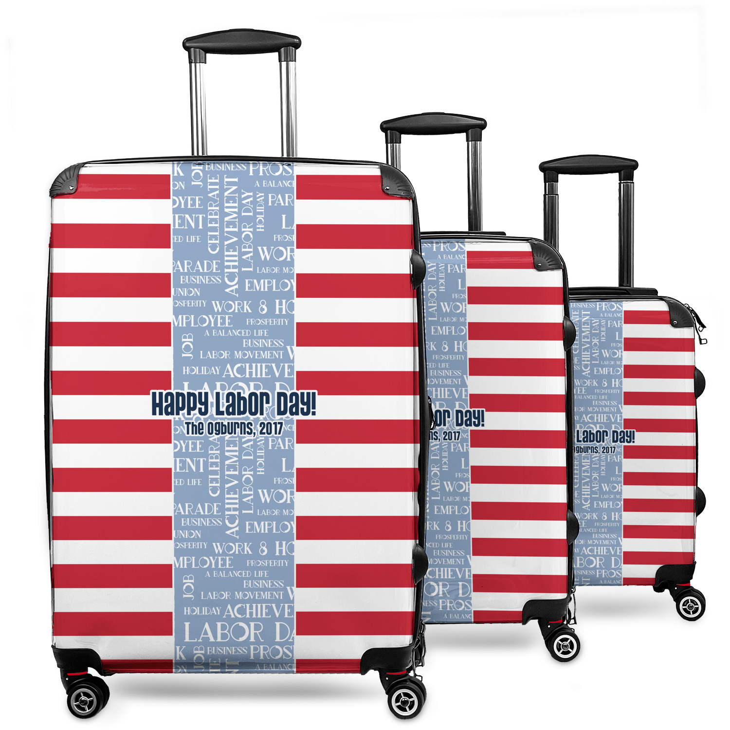 A fun red, white, and blue Labor Day badge is used in the coordinating part of the design. There are two different kinds of fonts used. One in the word cloud and one used in the personalization.