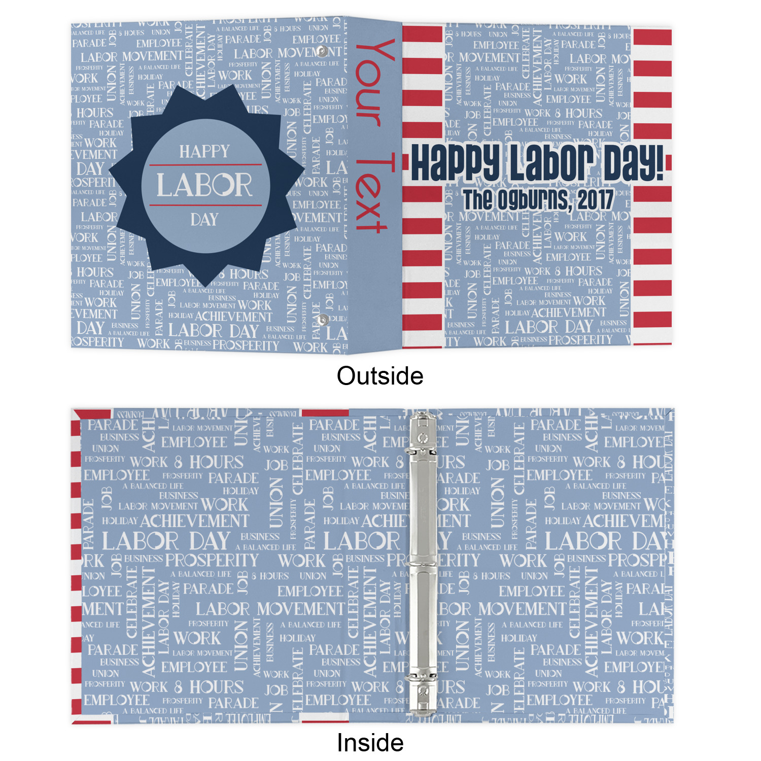 This Labor Design is a fun bright red and a subtle light blue, with white accenting all around. A red and white striped pattern is used, as well as a light blue pattern with a white word cloud on it. The word cloud pattern is a combination of themed words having to do with Labor Day, like "work," "prosperity," and "Labor Day." The red and white striped pattern is used on either side of the word cloud pattern, creating a three-part design.