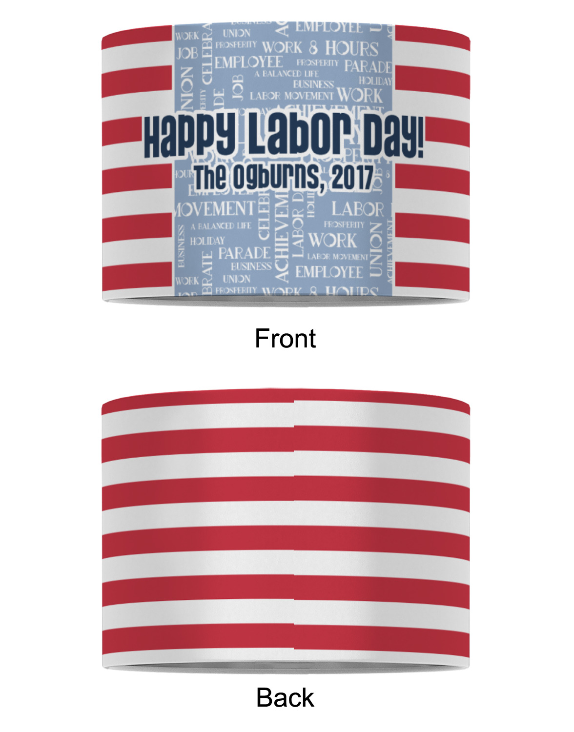 This Labor Design is a fun bright red and a subtle light blue, with white accenting all around. A red and white striped pattern is used, as well as a light blue pattern with a white word cloud on it. The word cloud pattern is a combination of themed words having to do with Labor Day, like "work," "prosperity," and "Labor Day." The red and white striped pattern is used on either side of the word cloud pattern, creating a three-part design.