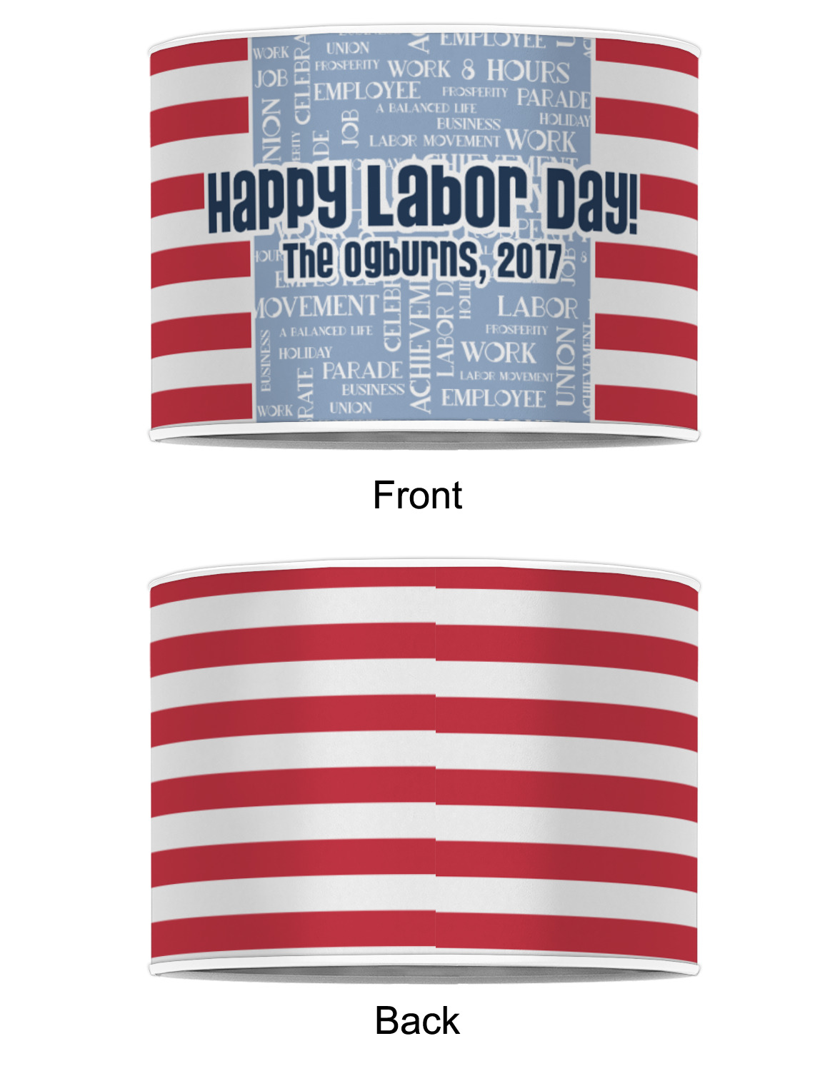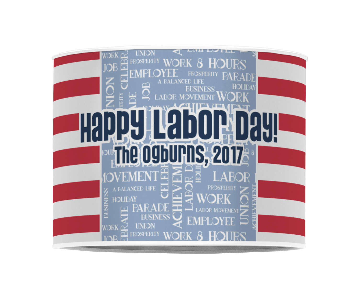 This Labor Design is a fun bright red and a subtle light blue, with white accenting all around. A red and white striped pattern is used, as well as a light blue pattern with a white word cloud on it. The word cloud pattern is a combination of themed words having to do with Labor Day, like "work," "prosperity," and "Labor Day." The red and white striped pattern is used on either side of the word cloud pattern, creating a three-part design.
