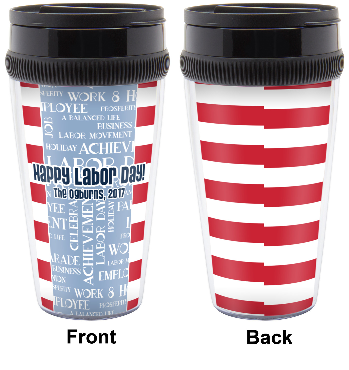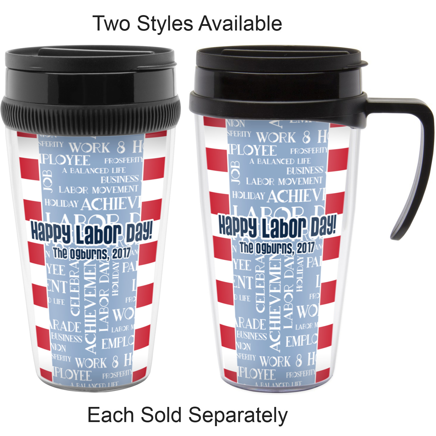 A fun red, white, and blue Labor Day badge is used in the coordinating part of the design. There are two different kinds of fonts used. One in the word cloud and one used in the personalization.