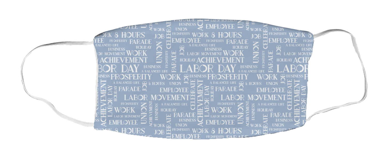 This Labor Design is a fun bright red and a subtle light blue, with white accenting all around. A red and white striped pattern is used, as well as a light blue pattern with a white word cloud on it. The word cloud pattern is a combination of themed words having to do with Labor Day, like "work," "prosperity," and "Labor Day." The red and white striped pattern is used on either side of the word cloud pattern, creating a three-part design.