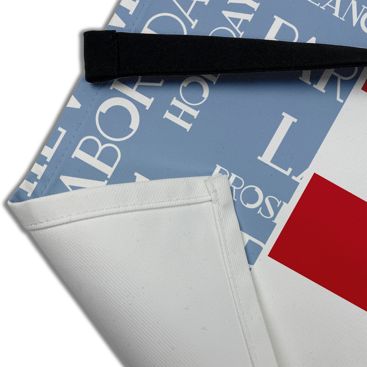 Our aprons are a lightweight yet durable polyester material. We offer two styles of aprons, one without pockets and one with two pockets adorning the center near the waistline. Each apron is one size* and comes with adjustable straps for both the neckline and waist. We print your custom design on the front of the apron to display your creativity!