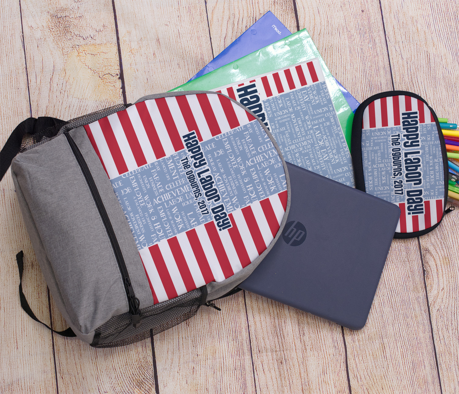 A fun red, white, and blue Labor Day badge is used in the coordinating part of the design. There are two different kinds of fonts used. One in the word cloud and one used in the personalization.
