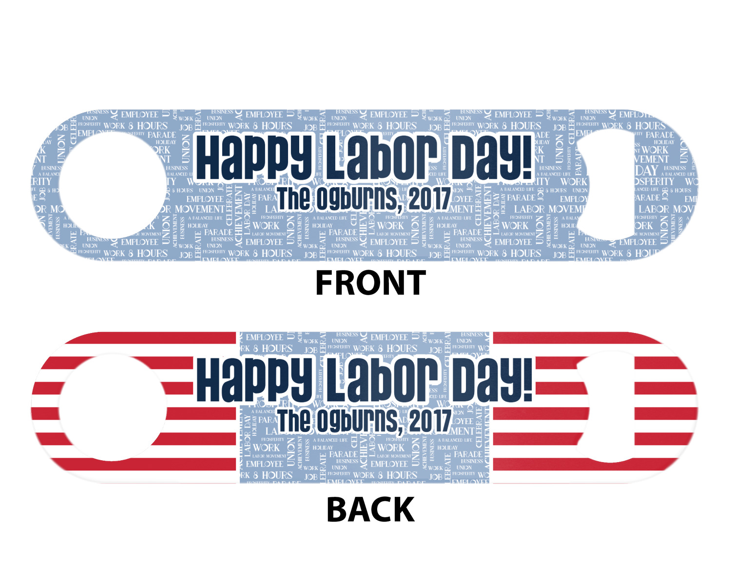 This Labor Design is a fun bright red and a subtle light blue, with white accenting all around. A red and white striped pattern is used, as well as a light blue pattern with a white word cloud on it. The word cloud pattern is a combination of themed words having to do with Labor Day, like "work," "prosperity," and "Labor Day." The red and white striped pattern is used on either side of the word cloud pattern, creating a three-part design.