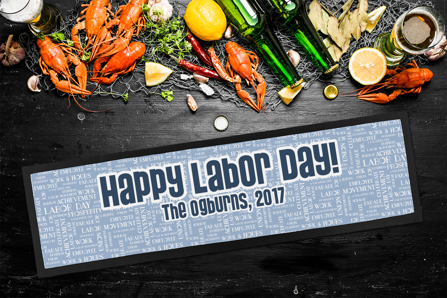 This Labor Design is a fun bright red and a subtle light blue, with white accenting all around. A red and white striped pattern is used, as well as a light blue pattern with a white word cloud on it. The word cloud pattern is a combination of themed words having to do with Labor Day, like "work," "prosperity," and "Labor Day." The red and white striped pattern is used on either side of the word cloud pattern, creating a three-part design.