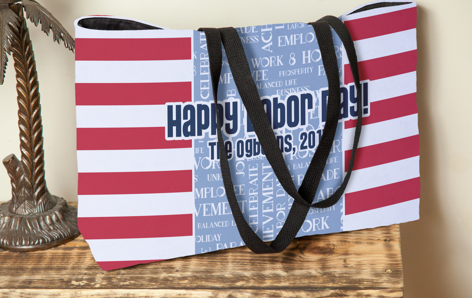 A fun red, white, and blue Labor Day badge is used in the coordinating part of the design. There are two different kinds of fonts used. One in the word cloud and one used in the personalization.