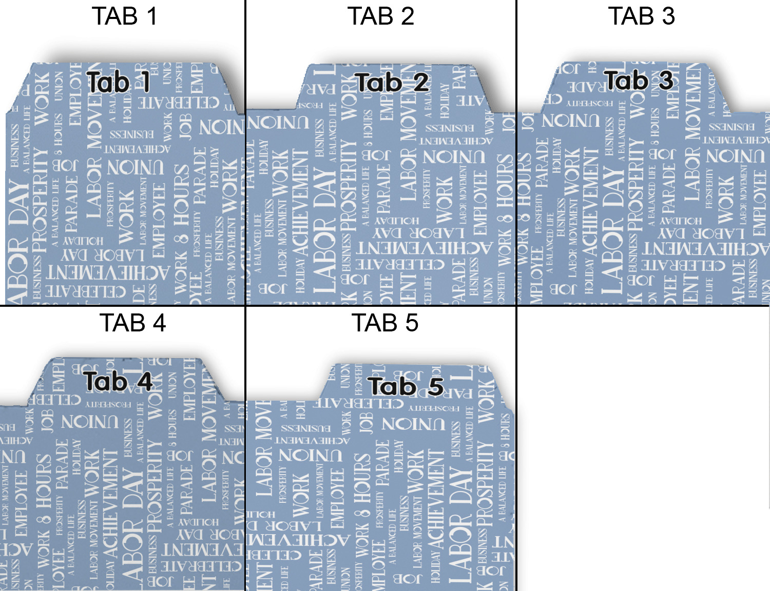 Whether you use binders at school or at work, we have designs to suit all of them. Available in 5 or 6 tab sets, you are sure to find a set to suit your needs. The back of each one is white and can be used to take notes, write vital information on, etc.