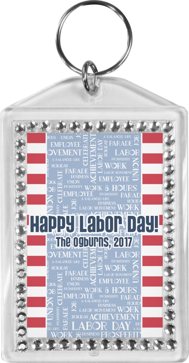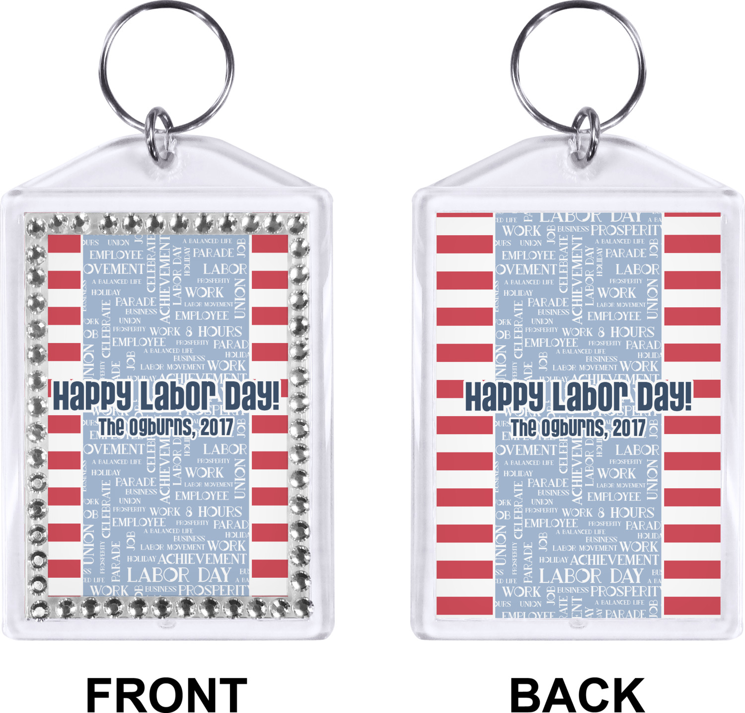 Our personalized keychains have a bold, rectangular shape, outlined by a series of shimmering rhinestones. A metal, split keyring is included with your purchase, and an additional metal hoop allows for attachment of the keychain to the split ring. This unique keychain measures at about 3.75 by 2.5 inches. We print your customized design(s) across both the back and front of this keychain.