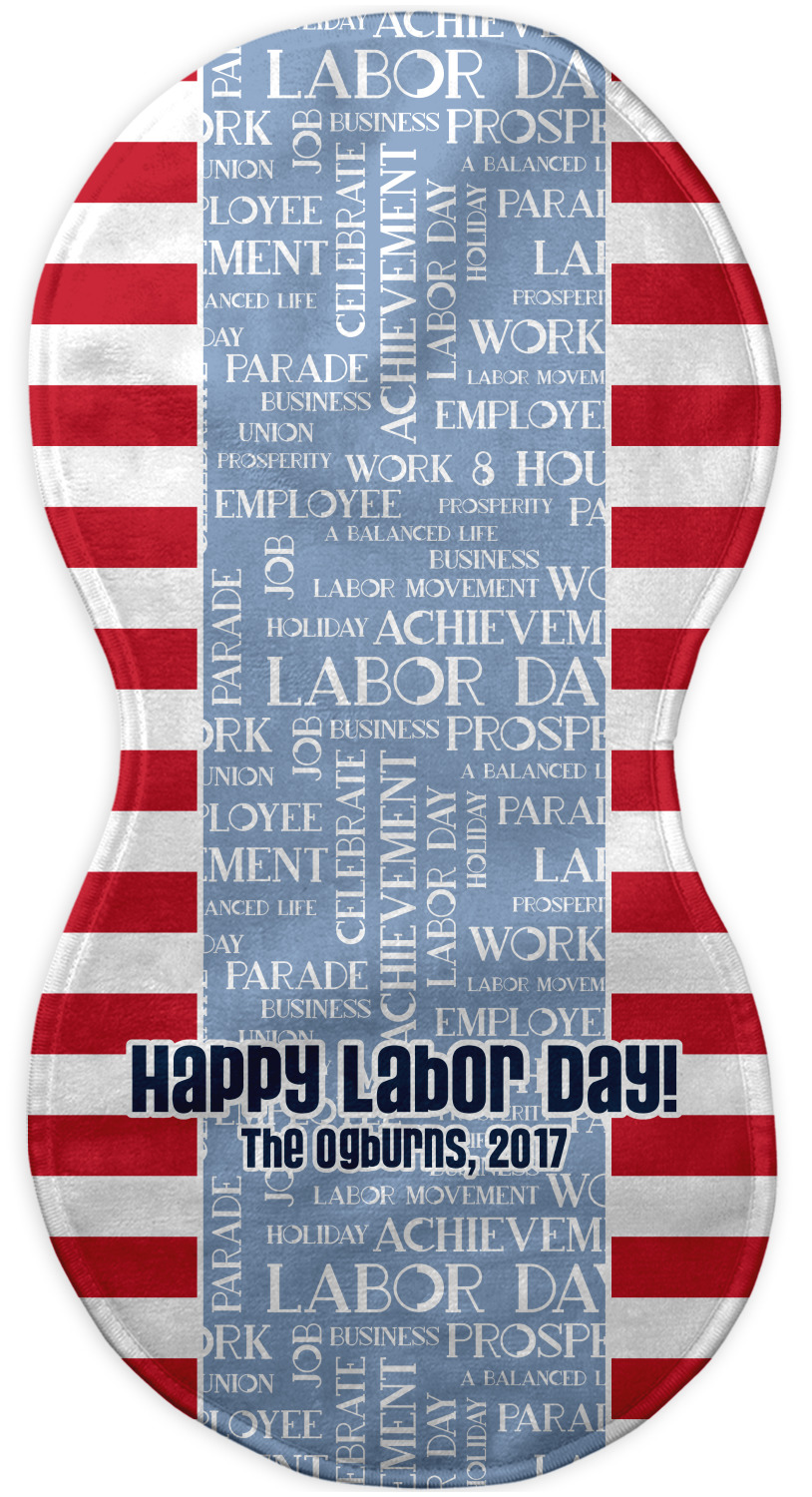This Labor Design is a fun bright red and a subtle light blue, with white accenting all around. A red and white striped pattern is used, as well as a light blue pattern with a white word cloud on it. The word cloud pattern is a combination of themed words having to do with Labor Day, like "work," "prosperity," and "Labor Day." The red and white striped pattern is used on either side of the word cloud pattern, creating a three-part design.