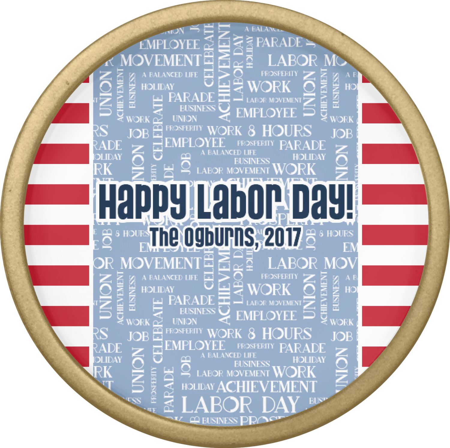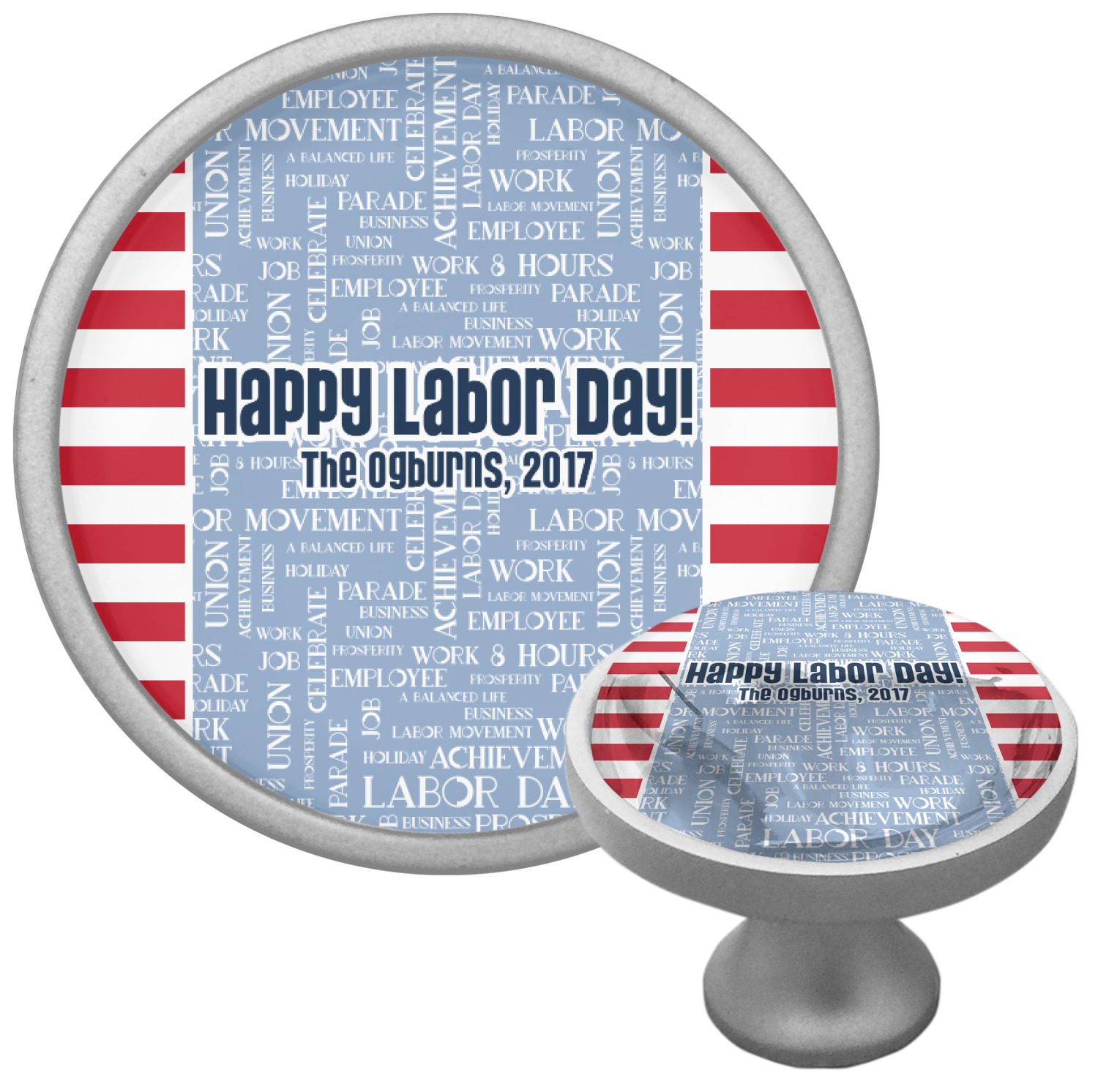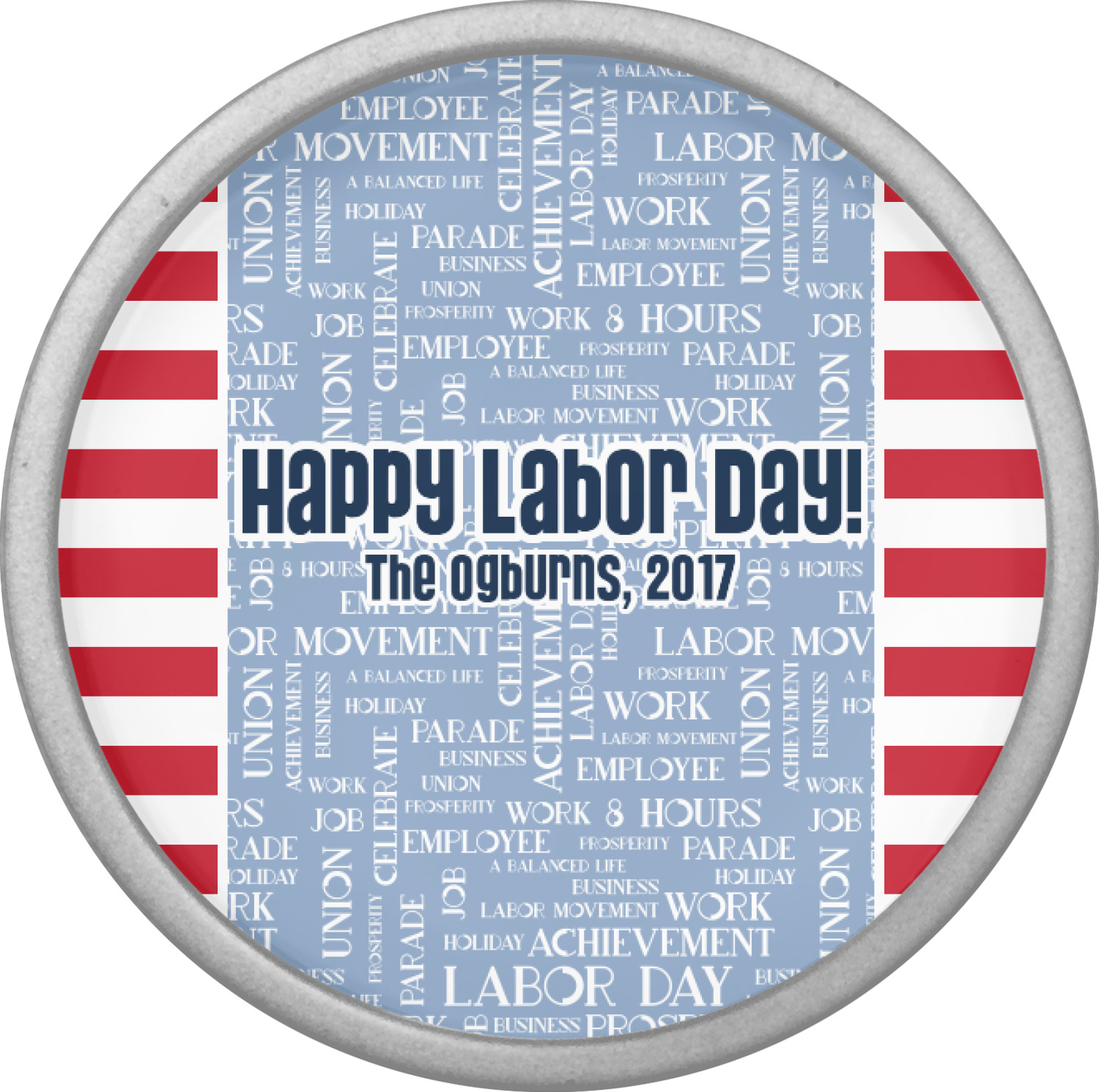 A fun red, white, and blue Labor Day badge is used in the coordinating part of the design. There are two different kinds of fonts used. One in the word cloud and one used in the personalization.