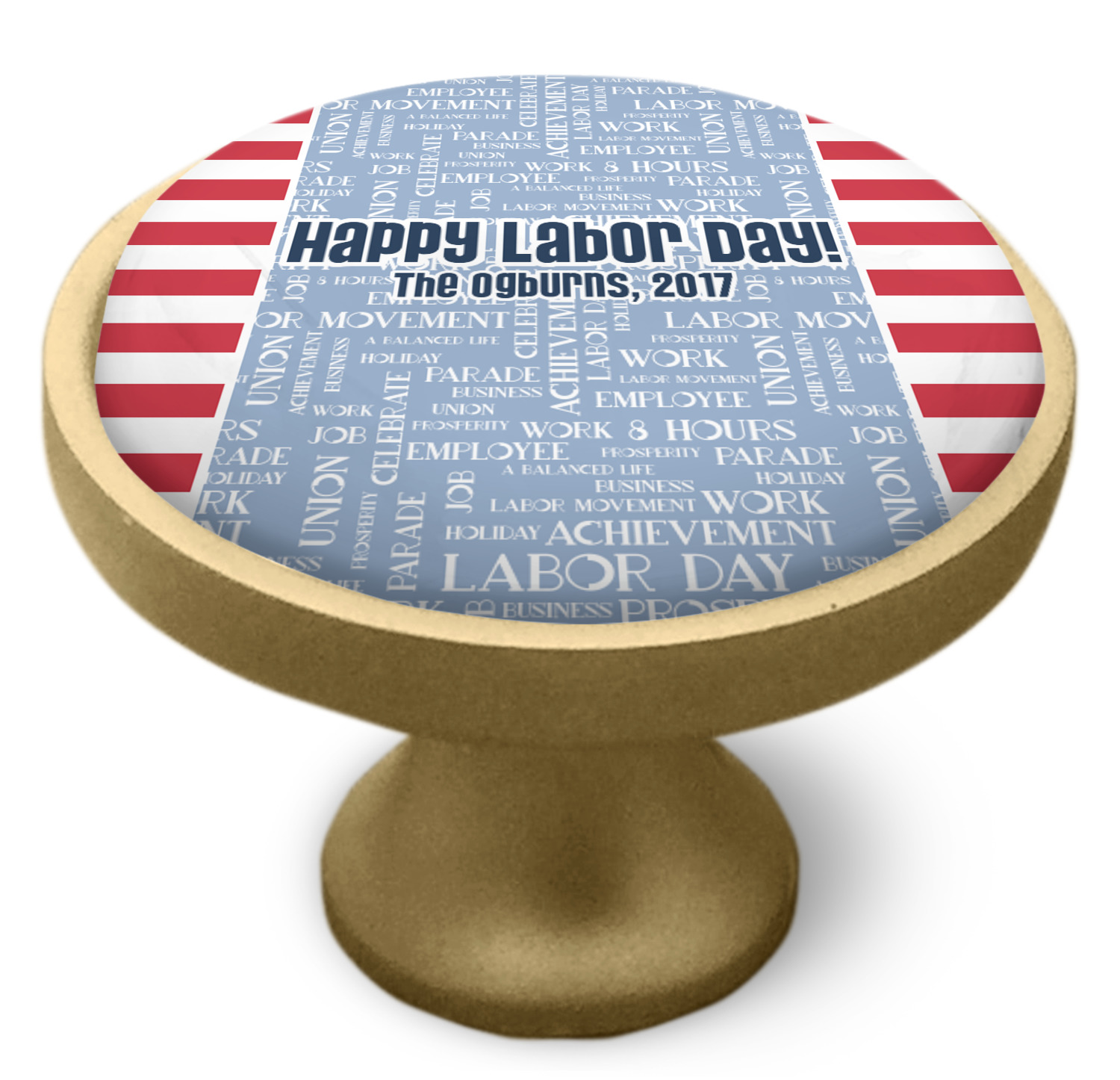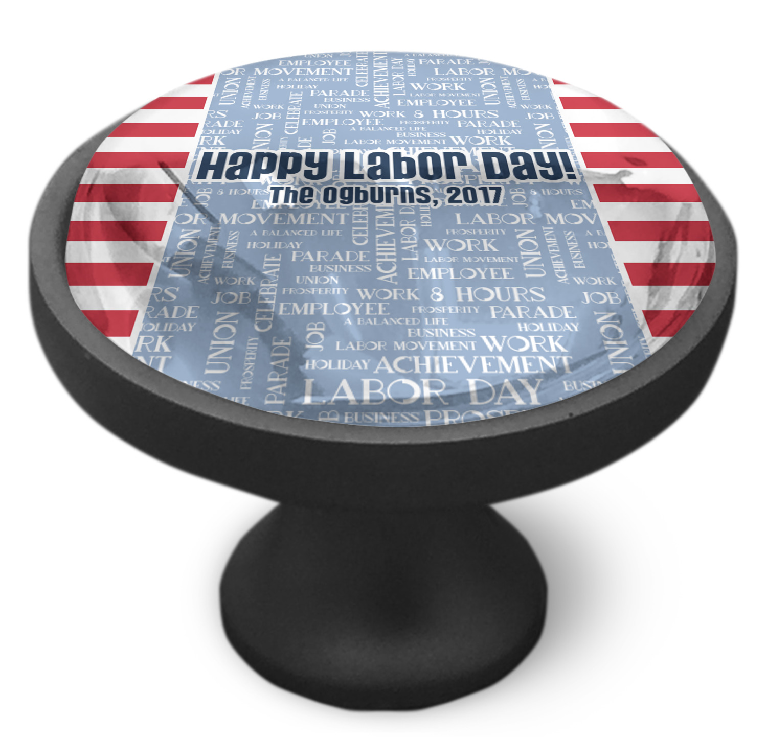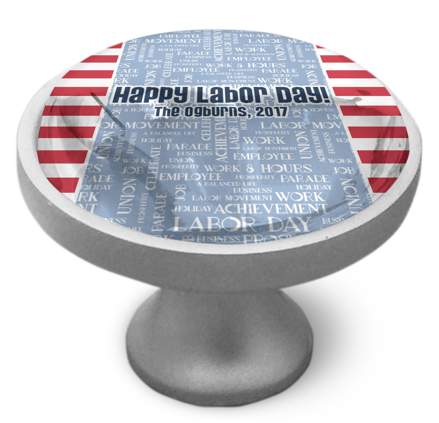 A fun red, white, and blue Labor Day badge is used in the coordinating part of the design. There are two different kinds of fonts used. One in the word cloud and one used in the personalization.