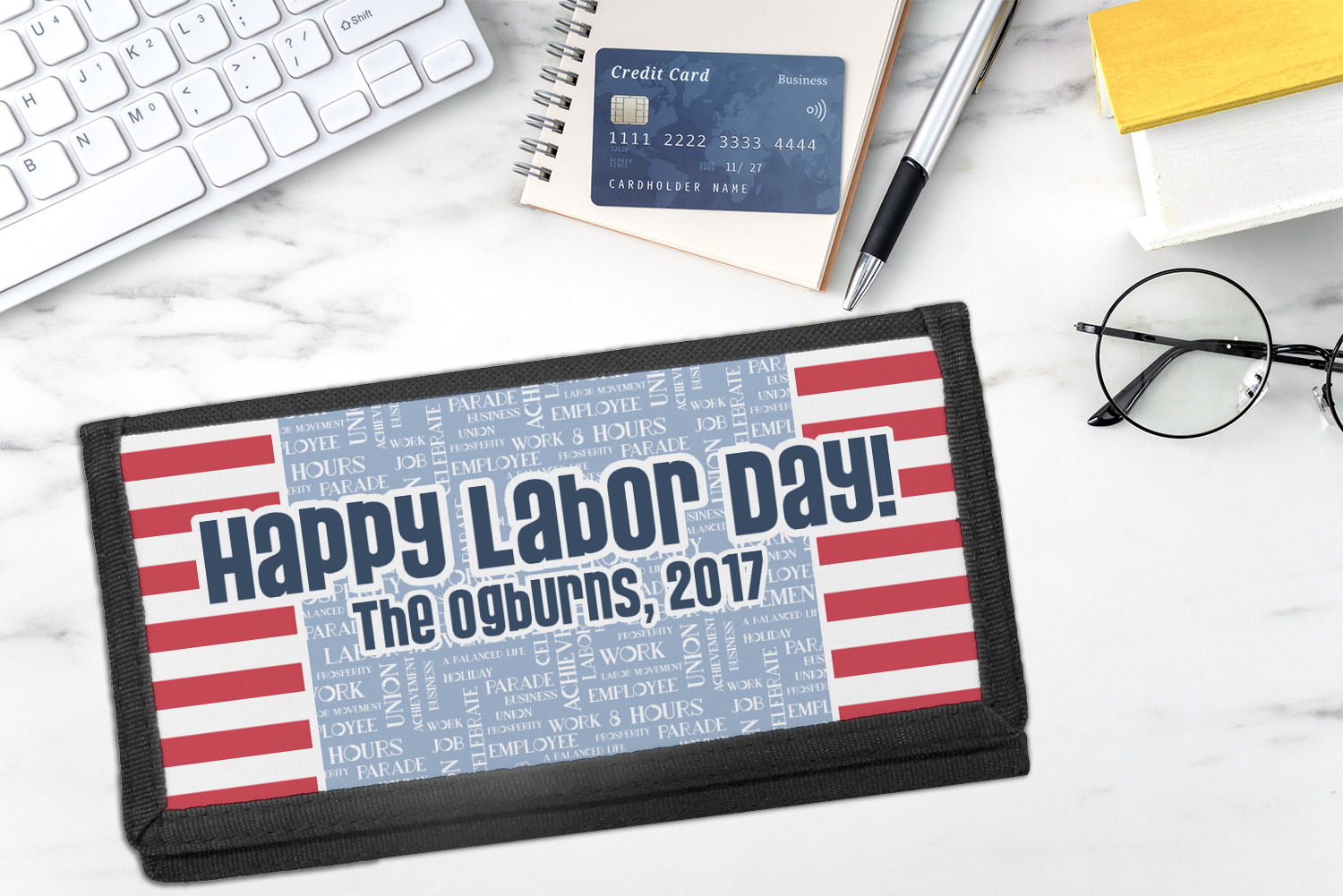 A fun red, white, and blue Labor Day badge is used in the coordinating part of the design. There are two different kinds of fonts used. One in the word cloud and one used in the personalization.