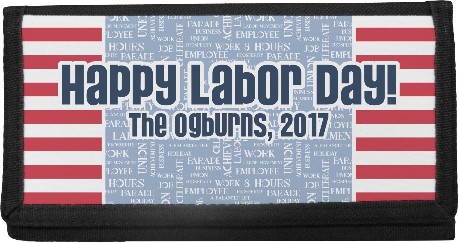 This Labor Design is a fun bright red and a subtle light blue, with white accenting all around. A red and white striped pattern is used, as well as a light blue pattern with a white word cloud on it. The word cloud pattern is a combination of themed words having to do with Labor Day, like "work," "prosperity," and "Labor Day." The red and white striped pattern is used on either side of the word cloud pattern, creating a three-part design.