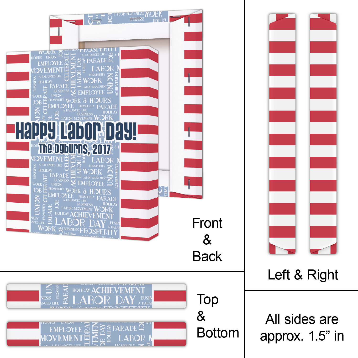 This Labor Design is a fun bright red and a subtle light blue, with white accenting all around. A red and white striped pattern is used, as well as a light blue pattern with a white word cloud on it. The word cloud pattern is a combination of themed words having to do with Labor Day, like "work," "prosperity," and "Labor Day." The red and white striped pattern is used on either side of the word cloud pattern, creating a three-part design.
