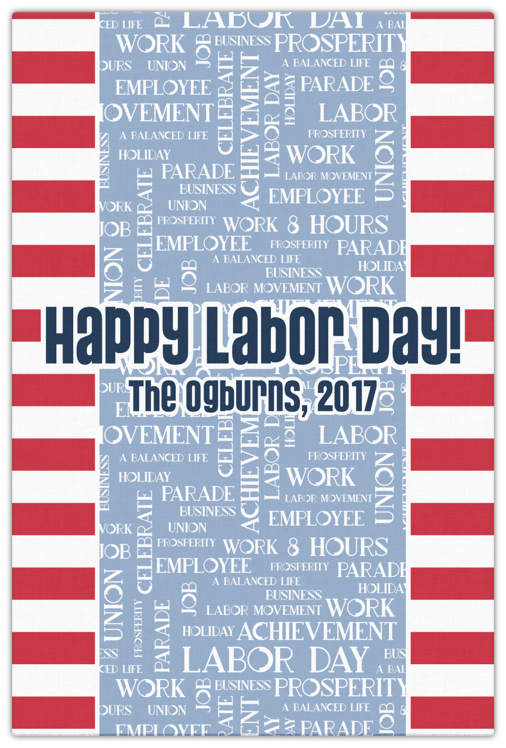 This Labor Design is a fun bright red and a subtle light blue, with white accenting all around. A red and white striped pattern is used, as well as a light blue pattern with a white word cloud on it. The word cloud pattern is a combination of themed words having to do with Labor Day, like "work," "prosperity," and "Labor Day." The red and white striped pattern is used on either side of the word cloud pattern, creating a three-part design.