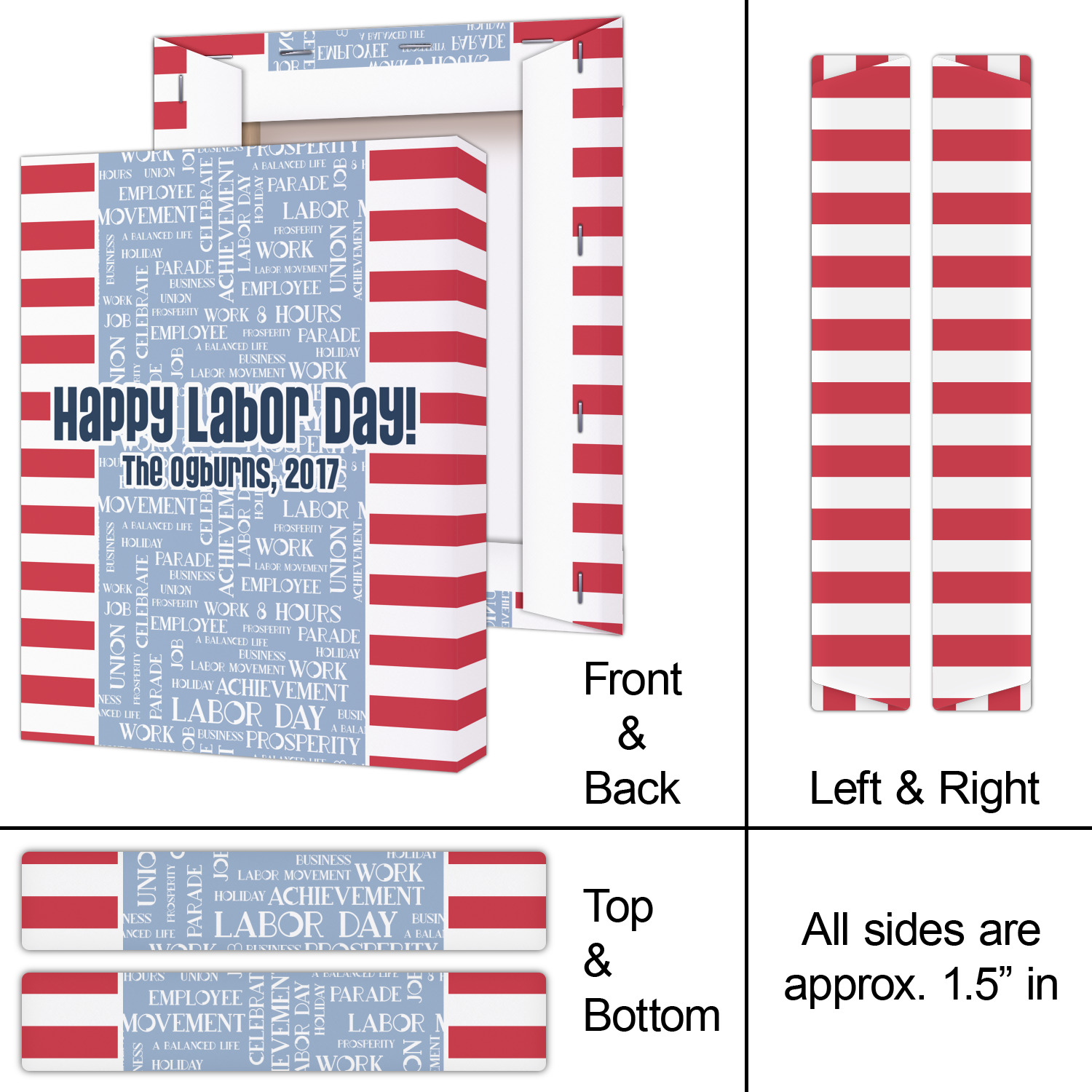 This Labor Design is a fun bright red and a subtle light blue, with white accenting all around. A red and white striped pattern is used, as well as a light blue pattern with a white word cloud on it. The word cloud pattern is a combination of themed words having to do with Labor Day, like "work," "prosperity," and "Labor Day." The red and white striped pattern is used on either side of the word cloud pattern, creating a three-part design.