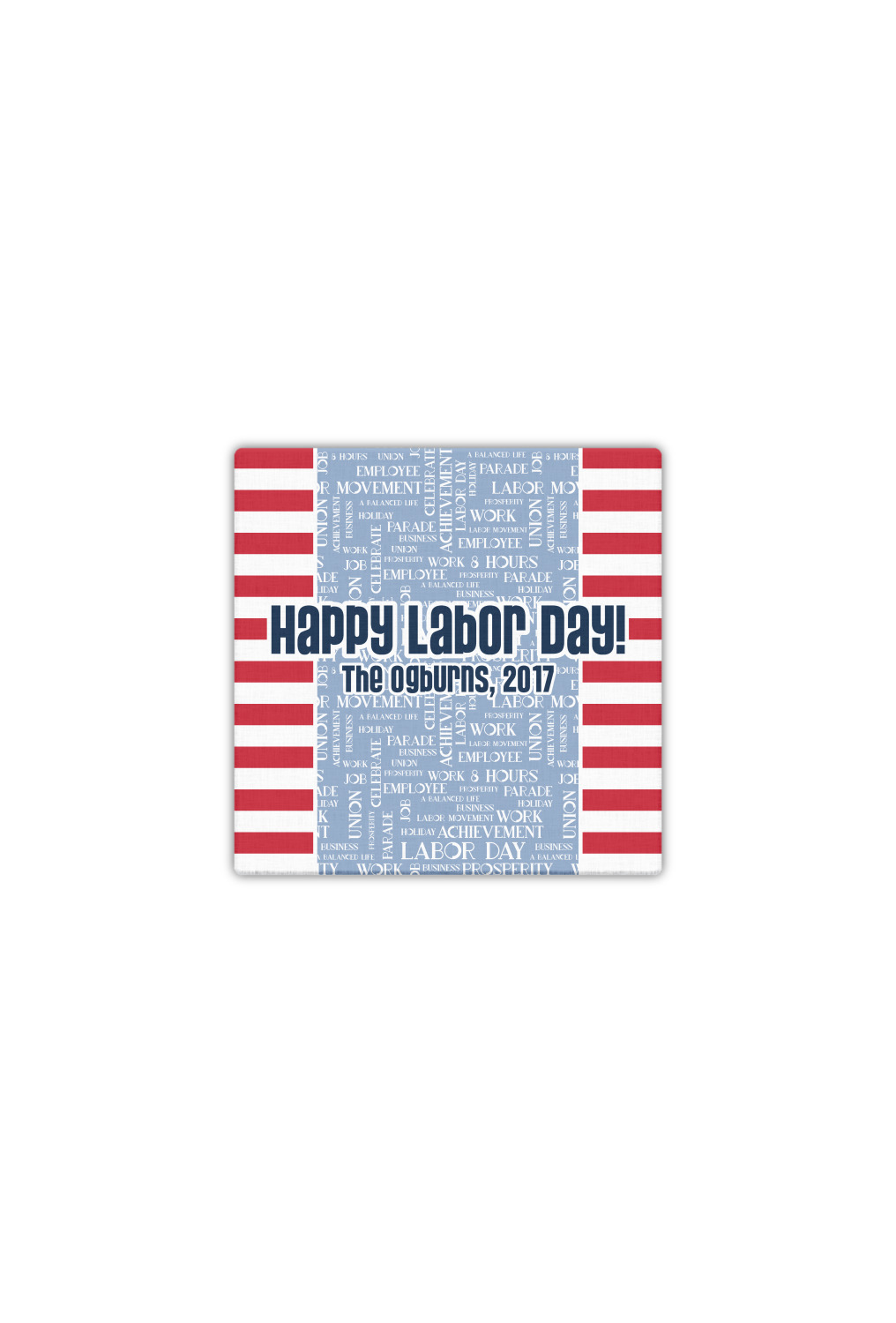 A fun red, white, and blue Labor Day badge is used in the coordinating part of the design. There are two different kinds of fonts used. One in the word cloud and one used in the personalization.