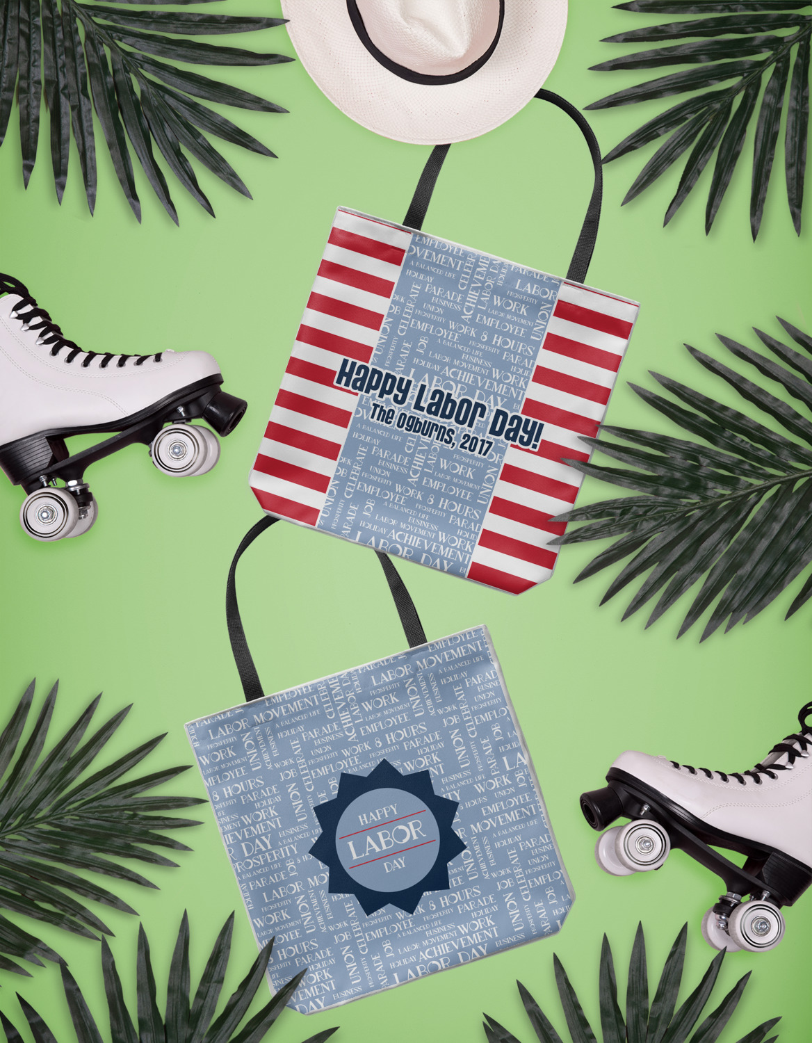 A fun red, white, and blue Labor Day badge is used in the coordinating part of the design. There are two different kinds of fonts used. One in the word cloud and one used in the personalization.