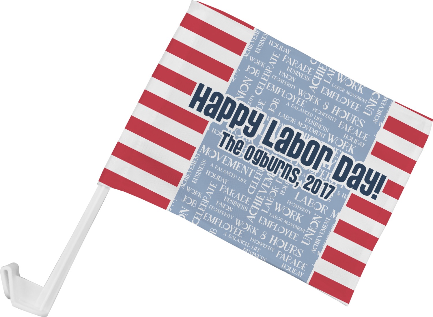 This Labor Design is a fun bright red and a subtle light blue, with white accenting all around. A red and white striped pattern is used, as well as a light blue pattern with a white word cloud on it. The word cloud pattern is a combination of themed words having to do with Labor Day, like "work," "prosperity," and "Labor Day." The red and white striped pattern is used on either side of the word cloud pattern, creating a three-part design.