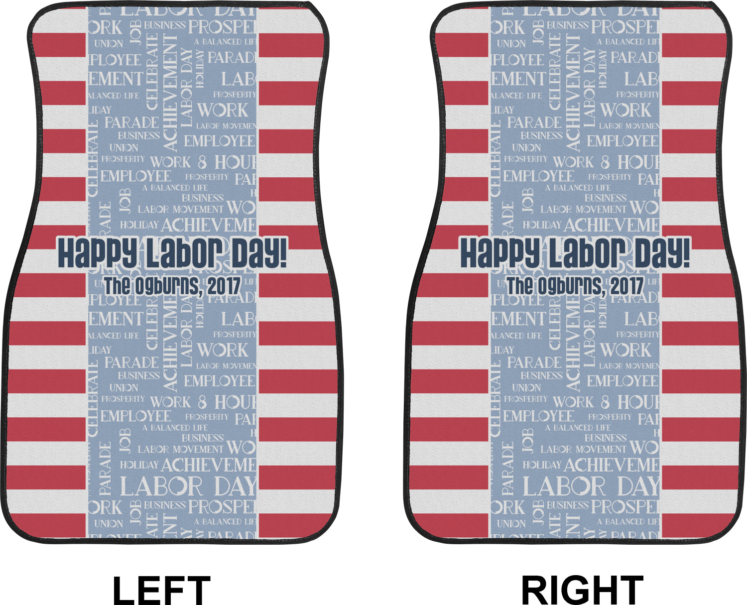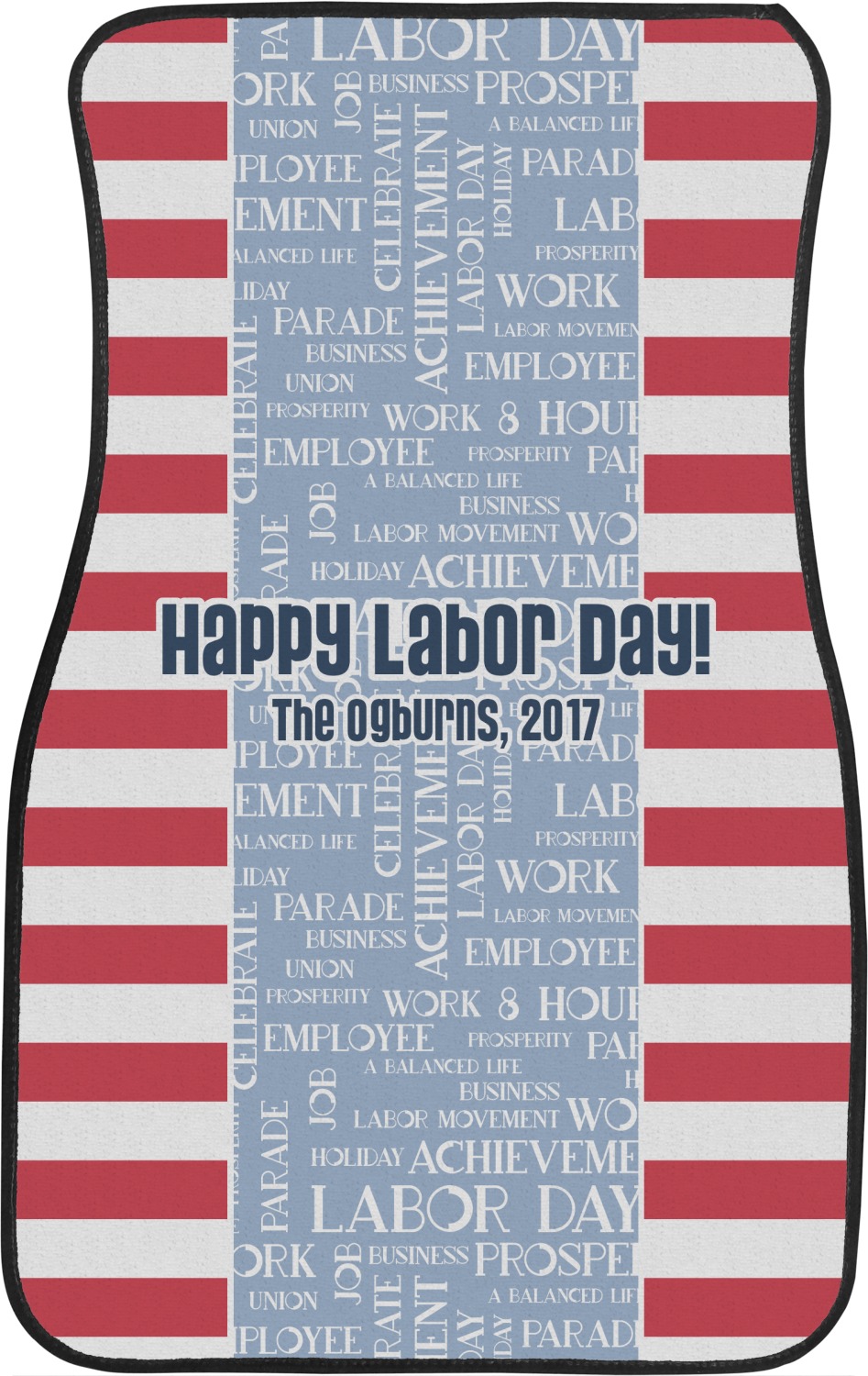 A fun red, white, and blue Labor Day badge is used in the coordinating part of the design. There are two different kinds of fonts used. One in the word cloud and one used in the personalization.