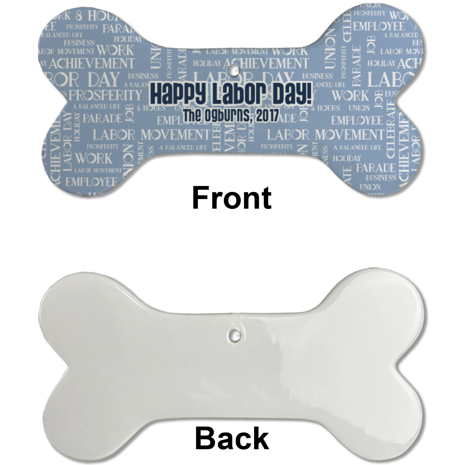 A fun red, white, and blue Labor Day badge is used in the coordinating part of the design. There are two different kinds of fonts used. One in the word cloud and one used in the personalization.