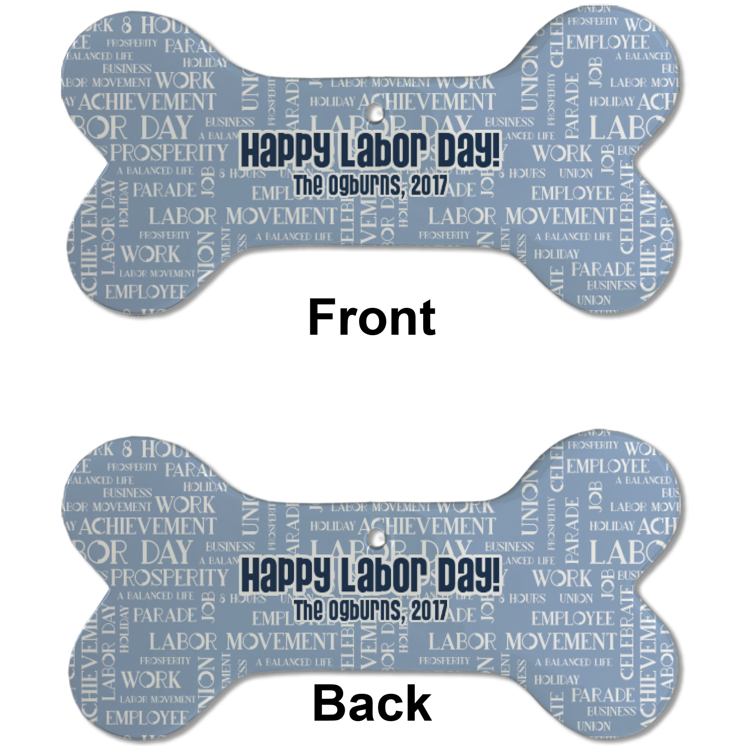 A fun red, white, and blue Labor Day badge is used in the coordinating part of the design. There are two different kinds of fonts used. One in the word cloud and one used in the personalization.