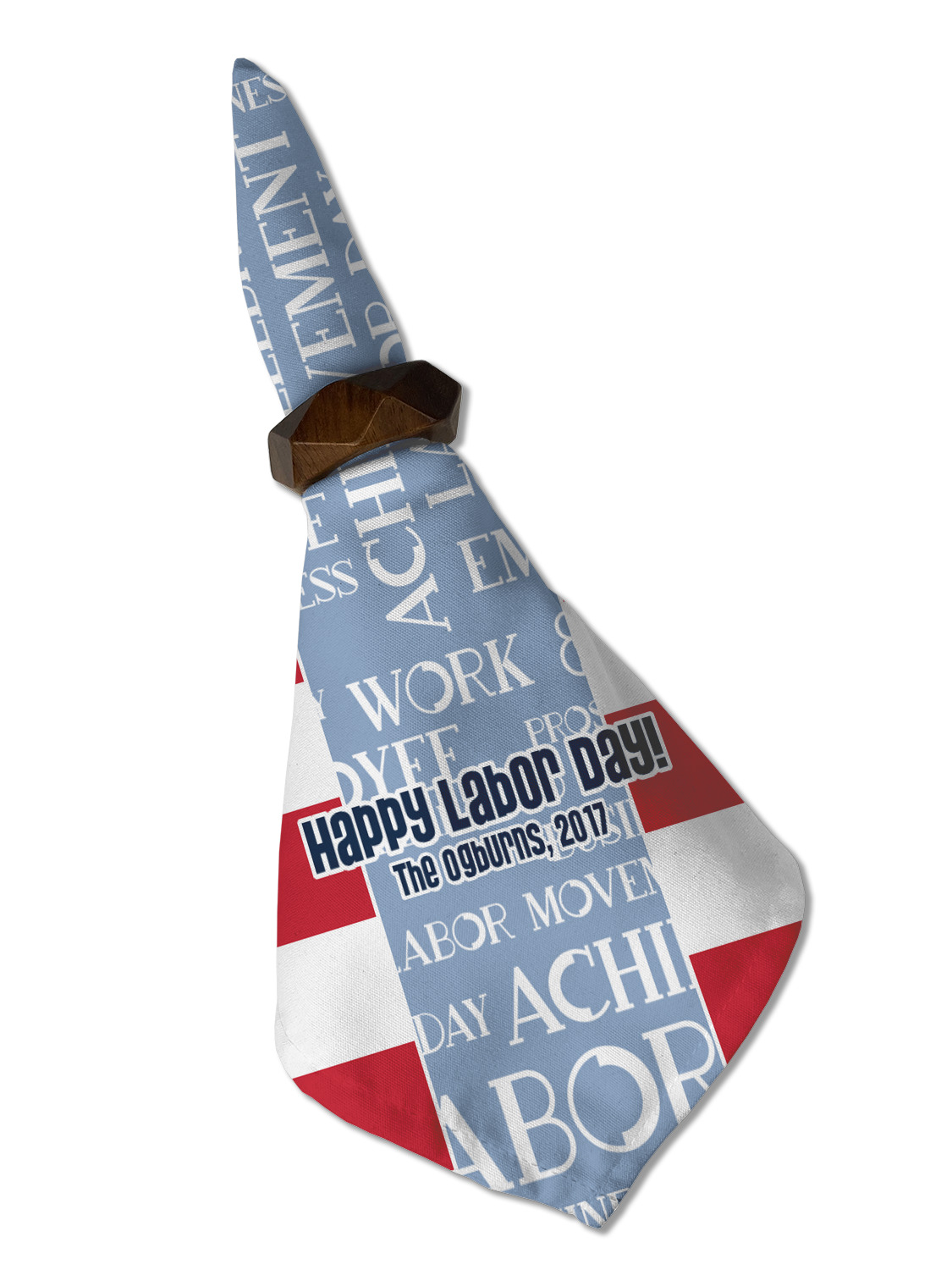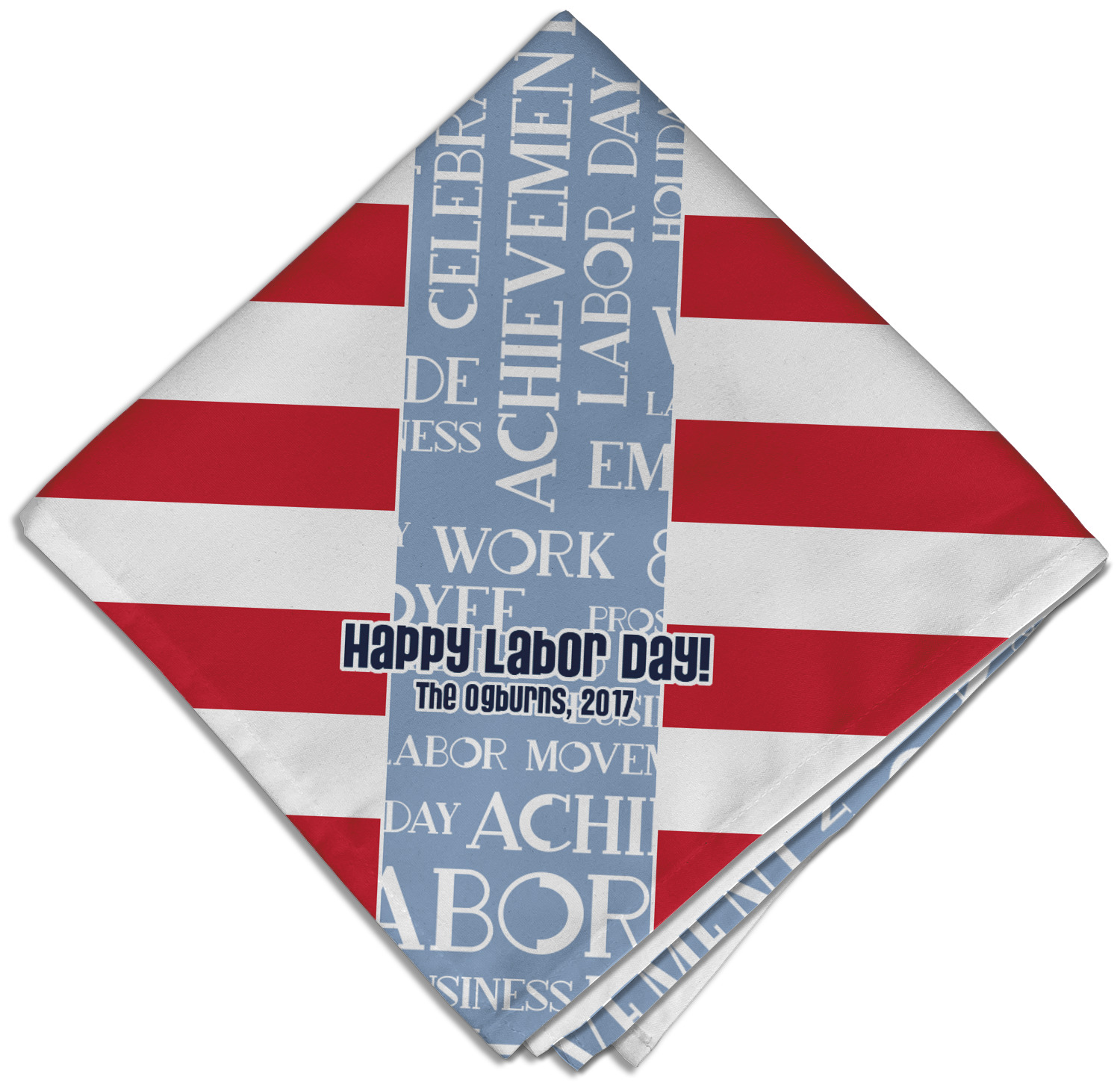 This Labor Design is a fun bright red and a subtle light blue, with white accenting all around. A red and white striped pattern is used, as well as a light blue pattern with a white word cloud on it. The word cloud pattern is a combination of themed words having to do with Labor Day, like "work," "prosperity," and "Labor Day." The red and white striped pattern is used on either side of the word cloud pattern, creating a three-part design.