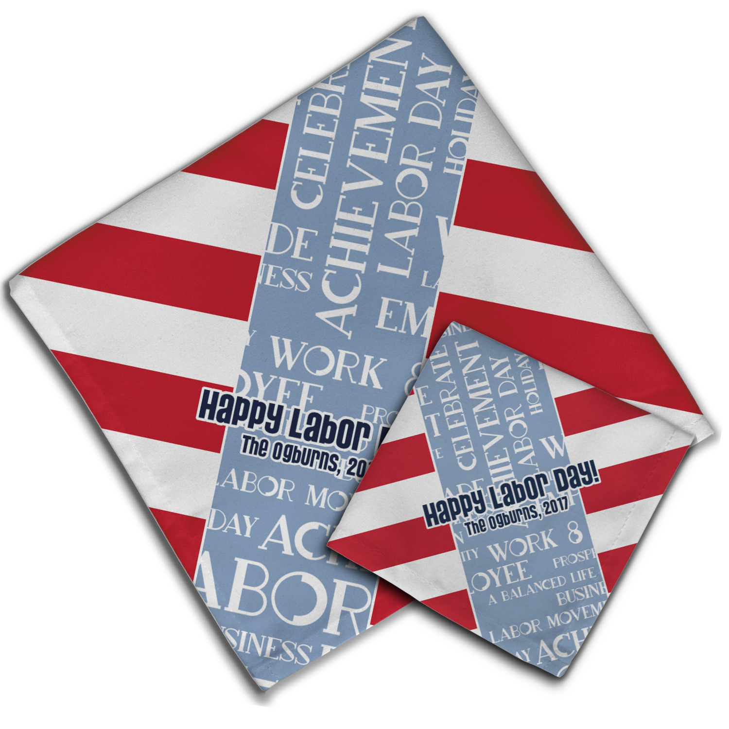 This Labor Design is a fun bright red and a subtle light blue, with white accenting all around. A red and white striped pattern is used, as well as a light blue pattern with a white word cloud on it. The word cloud pattern is a combination of themed words having to do with Labor Day, like "work," "prosperity," and "Labor Day." The red and white striped pattern is used on either side of the word cloud pattern, creating a three-part design.