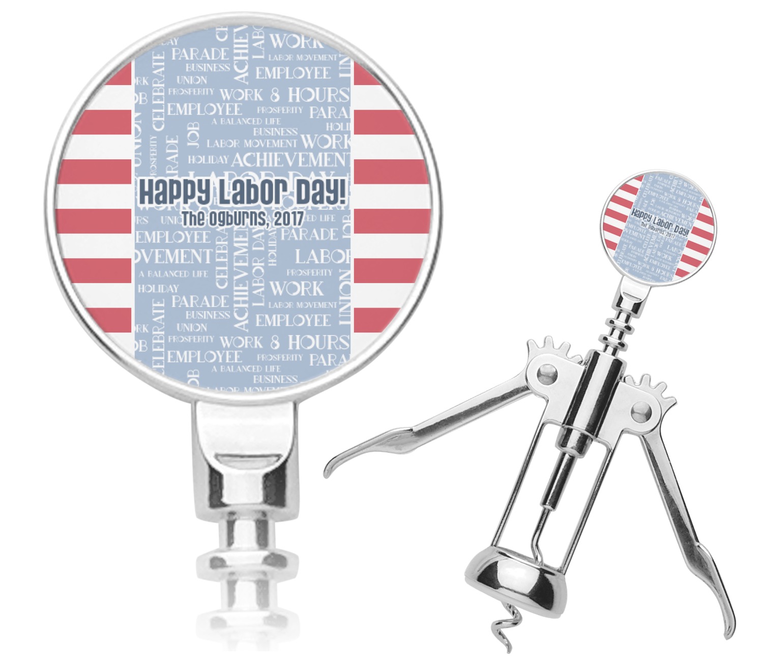 A fun red, white, and blue Labor Day badge is used in the coordinating part of the design. There are two different kinds of fonts used. One in the word cloud and one used in the personalization.