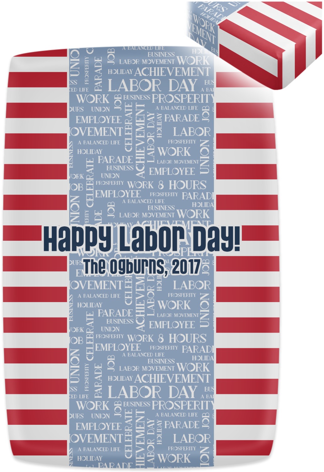 A fun red, white, and blue Labor Day badge is used in the coordinating part of the design. There are two different kinds of fonts used. One in the word cloud and one used in the personalization.
