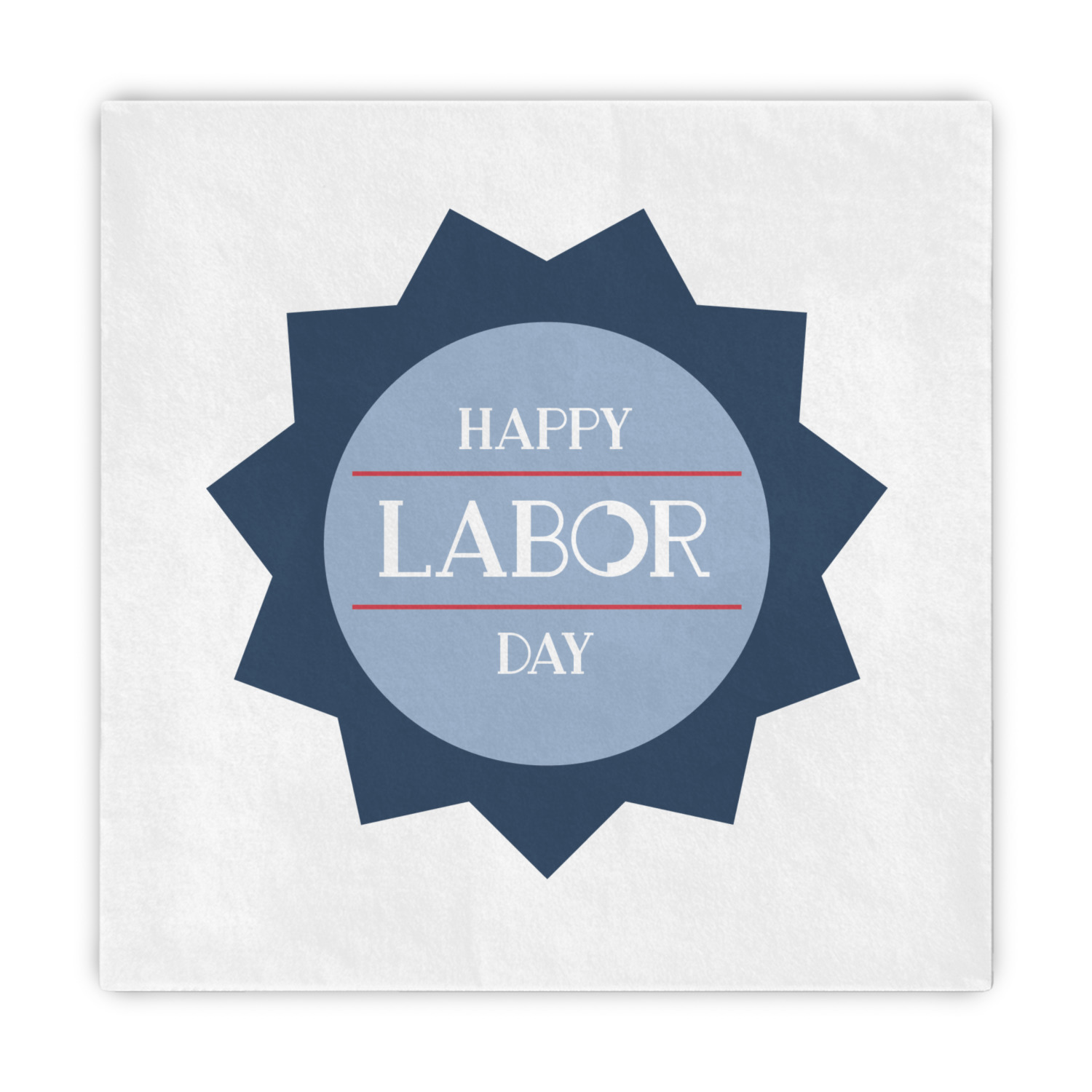 This Labor Design is a fun bright red and a subtle light blue, with white accenting all around. A red and white striped pattern is used, as well as a light blue pattern with a white word cloud on it. The word cloud pattern is a combination of themed words having to do with Labor Day, like "work," "prosperity," and "Labor Day." The red and white striped pattern is used on either side of the word cloud pattern, creating a three-part design.