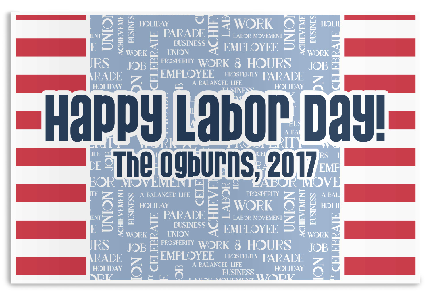 This Labor Design is a fun bright red and a subtle light blue, with white accenting all around. A red and white striped pattern is used, as well as a light blue pattern with a white word cloud on it. The word cloud pattern is a combination of themed words having to do with Labor Day, like "work," "prosperity," and "Labor Day." The red and white striped pattern is used on either side of the word cloud pattern, creating a three-part design.