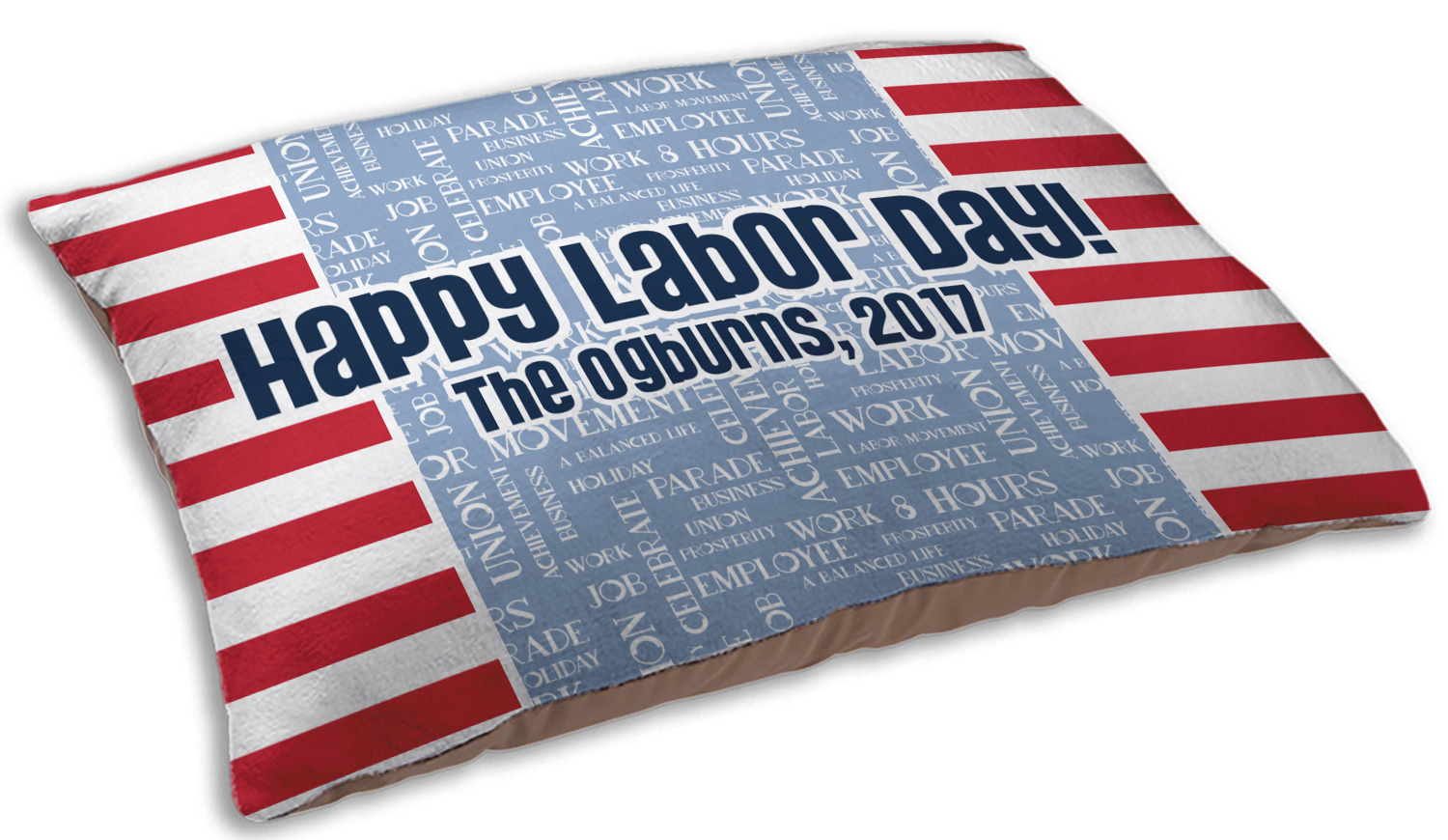 A fun red, white, and blue Labor Day badge is used in the coordinating part of the design. There are two different kinds of fonts used. One in the word cloud and one used in the personalization.