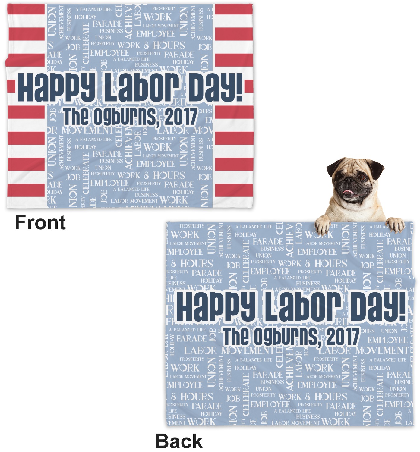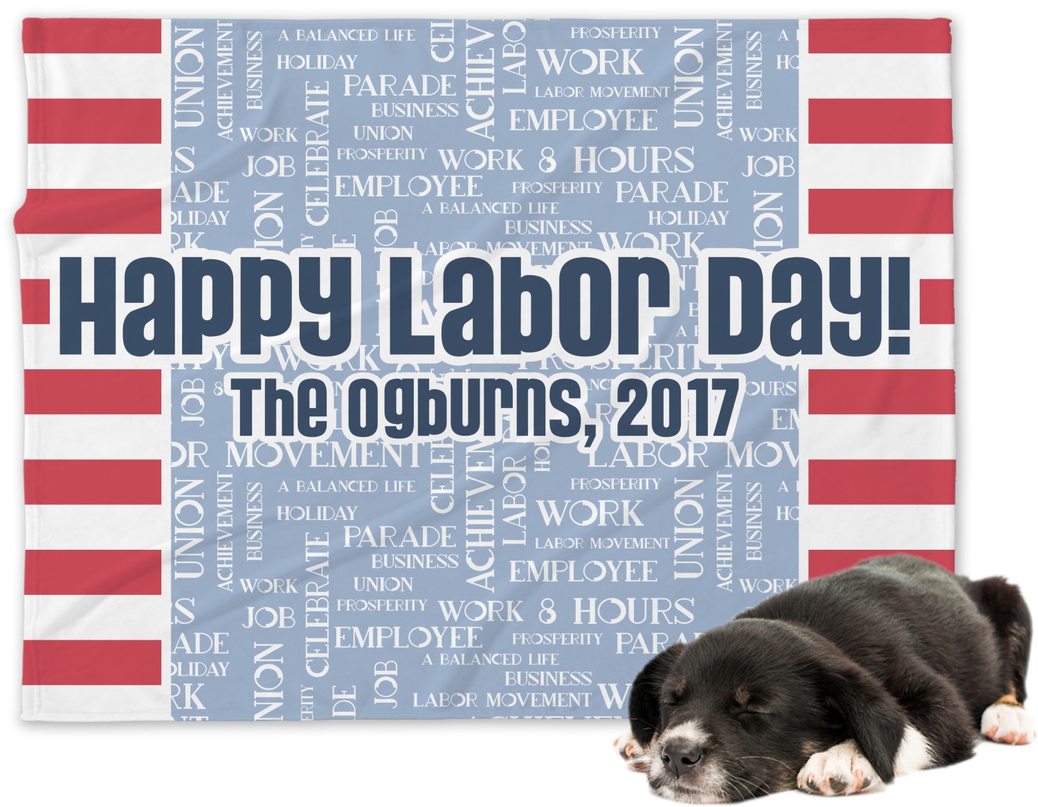 A fun red, white, and blue Labor Day badge is used in the coordinating part of the design. There are two different kinds of fonts used. One in the word cloud and one used in the personalization.