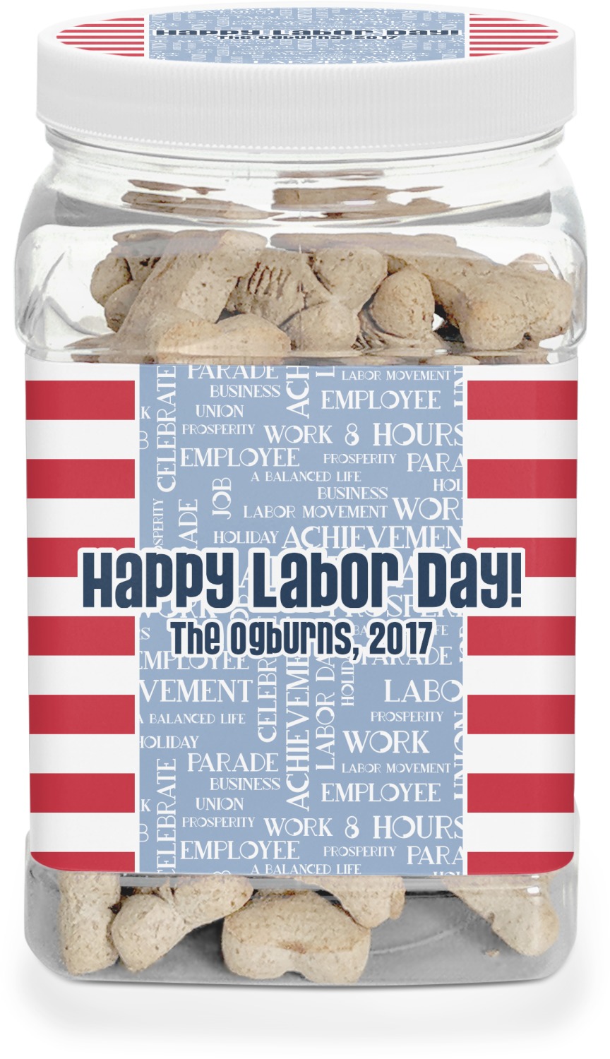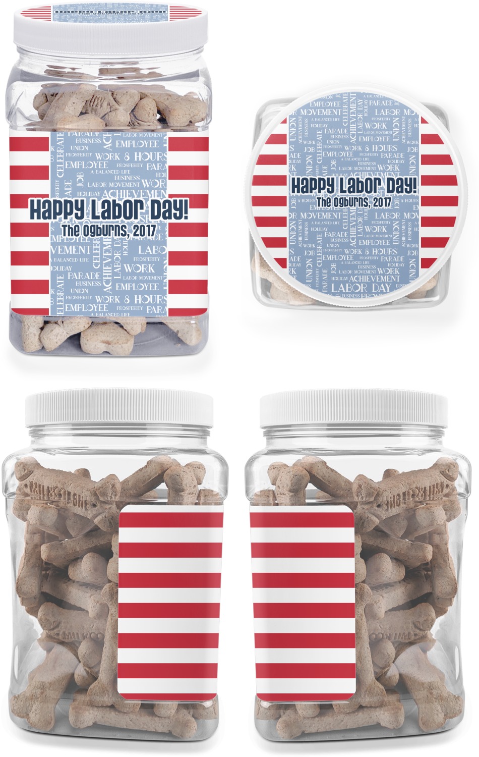 This half gallon jar, made from a sturdy plastic, is the perfect way to keep treats from any naughty pet paws, while still keeping them ready on hand for when your pup performs an impressive trick. This dog cookie jar features a screw-on, white lid that displays your personalized design on a vinyl sticker. We apply another customized sticker that wraps around the front and sides of the jar. Our dog treat jar also has indentations on the rear ends of the sides, which allows for convenient handling, and its square frame allows for easy storage.