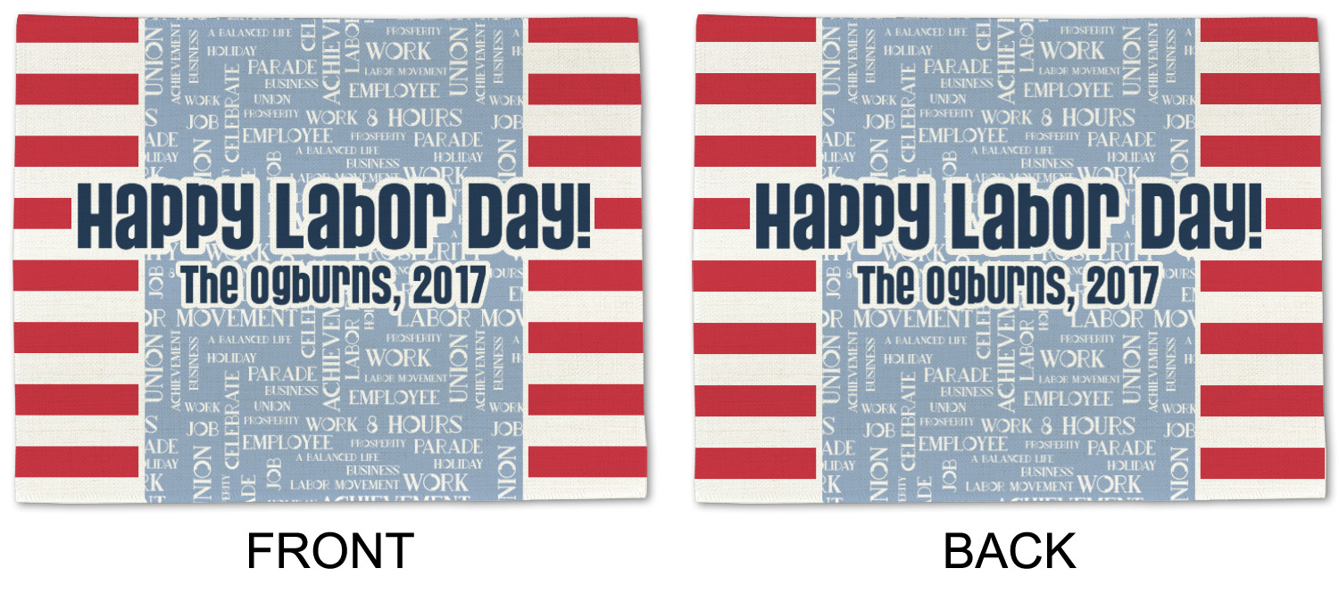 A fun red, white, and blue Labor Day badge is used in the coordinating part of the design. There are two different kinds of fonts used. One in the word cloud and one used in the personalization.