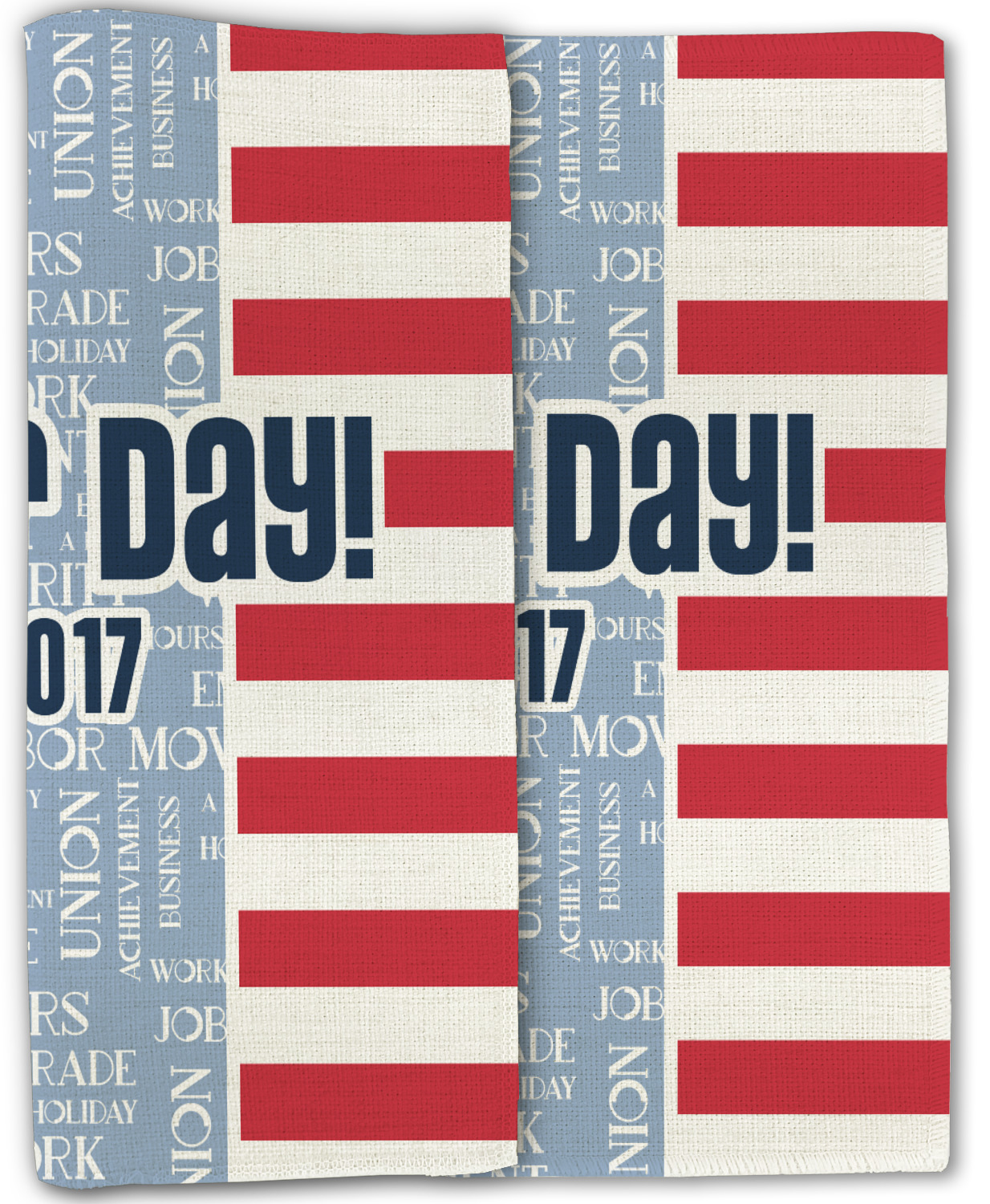 This Labor Design is a fun bright red and a subtle light blue, with white accenting all around. A red and white striped pattern is used, as well as a light blue pattern with a white word cloud on it. The word cloud pattern is a combination of themed words having to do with Labor Day, like "work," "prosperity," and "Labor Day." The red and white striped pattern is used on either side of the word cloud pattern, creating a three-part design.
