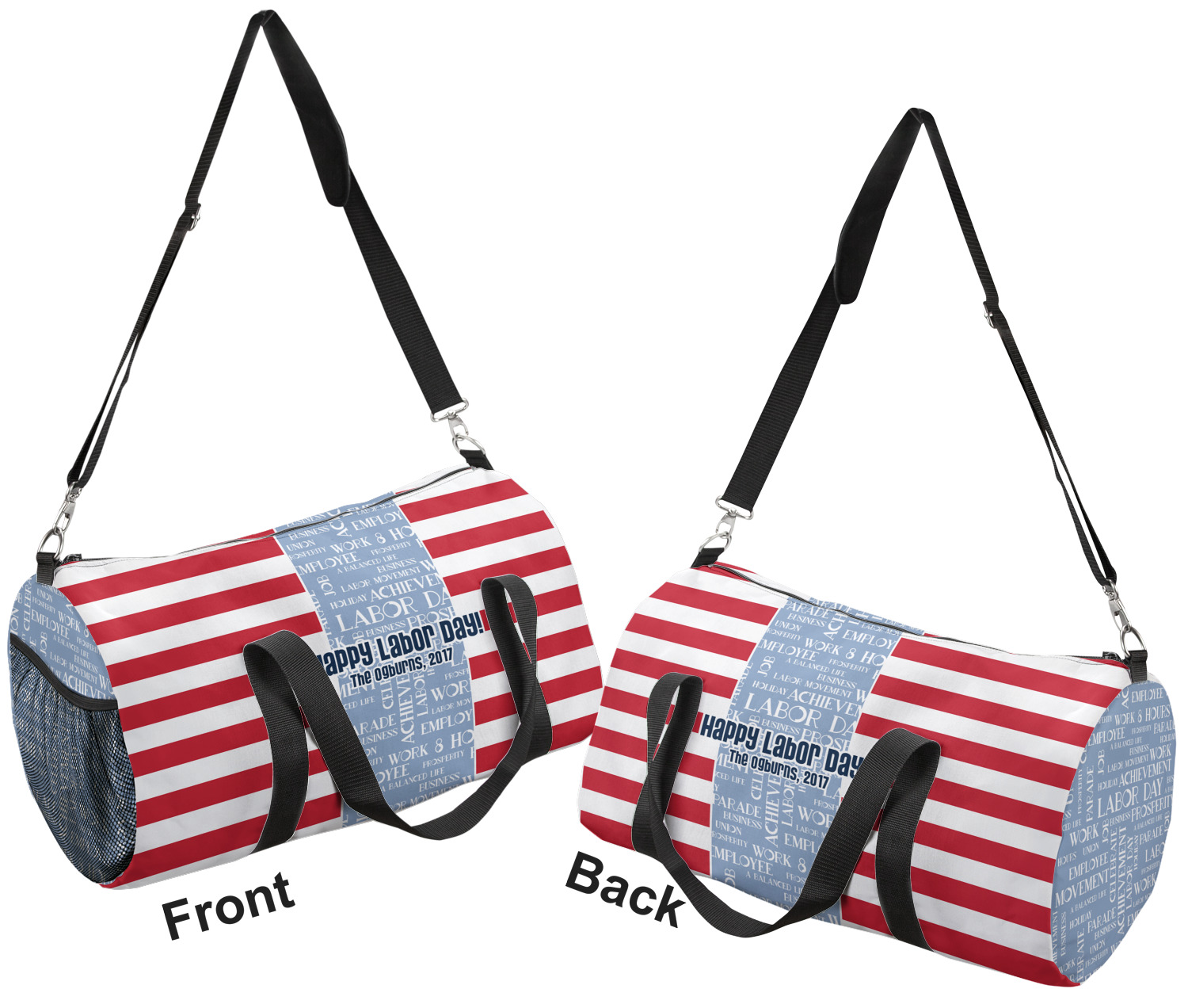 This duffle is a sturdy bag made of a canvas material. It comes in two sizes: Small (19"W x 9.5"H x 9.5"D) and Large (23"W x 12"H x 12"D). The bag is a cylindrical shape with a black adjustable strap and two handles. On one side is an elastic pouch to put a waterbottle or other small item. Your product will be sublimated with your design and is able to be designed on the front, back, and sides. Be sure to remember that the straps may cut into parts of your design if you upload your own artwork.