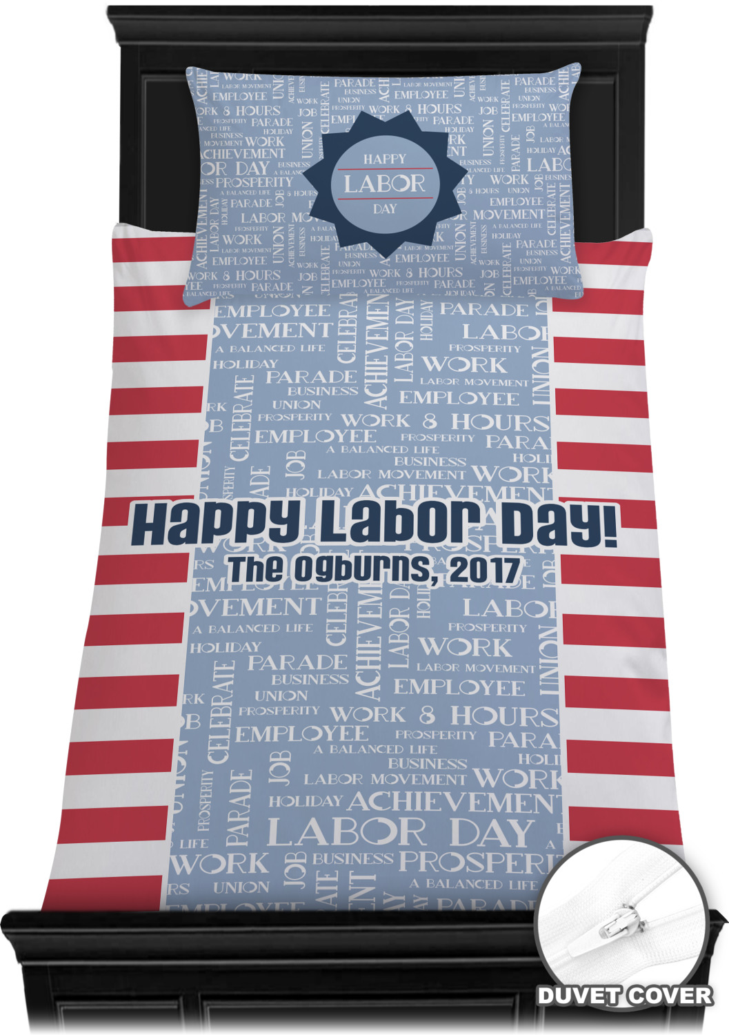 A fun red, white, and blue Labor Day badge is used in the coordinating part of the design. There are two different kinds of fonts used. One in the word cloud and one used in the personalization.