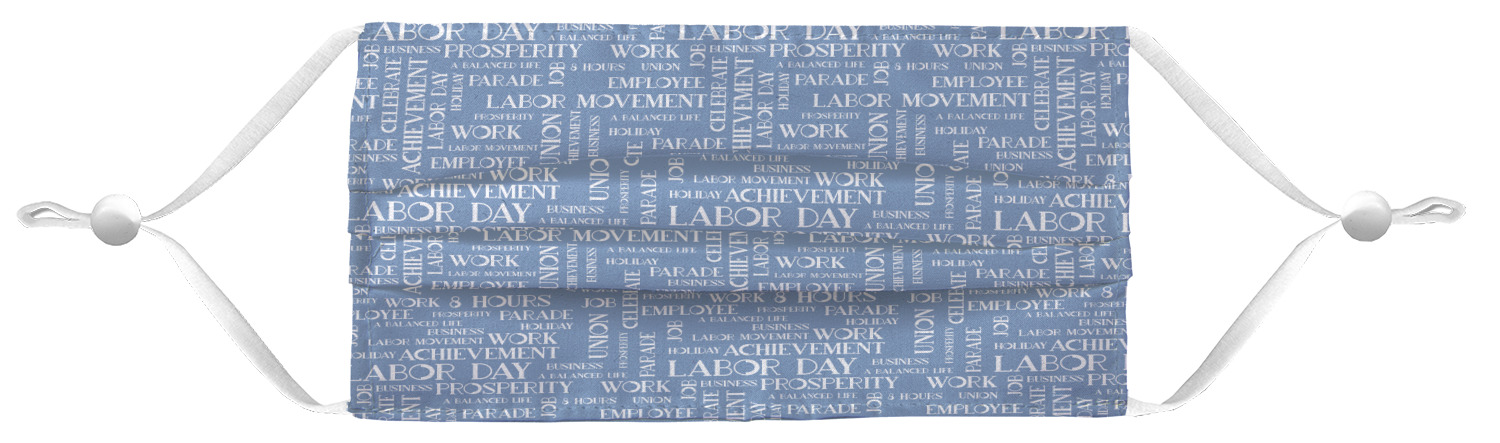 This Labor Design is a fun bright red and a subtle light blue, with white accenting all around. A red and white striped pattern is used, as well as a light blue pattern with a white word cloud on it. The word cloud pattern is a combination of themed words having to do with Labor Day, like "work," "prosperity," and "Labor Day." The red and white striped pattern is used on either side of the word cloud pattern, creating a three-part design.