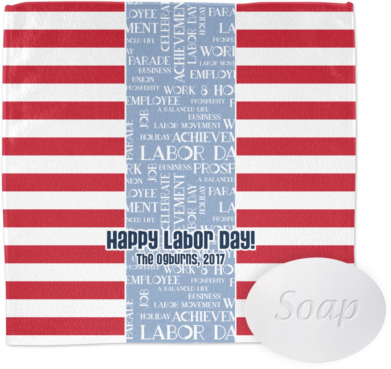 A fun red, white, and blue Labor Day badge is used in the coordinating part of the design. There are two different kinds of fonts used. One in the word cloud and one used in the personalization.