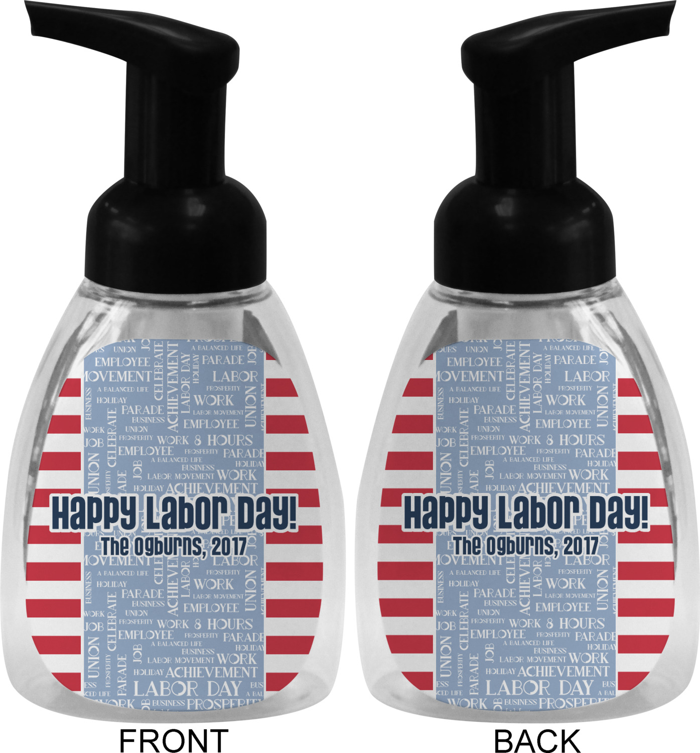 A fun red, white, and blue Labor Day badge is used in the coordinating part of the design. There are two different kinds of fonts used. One in the word cloud and one used in the personalization.