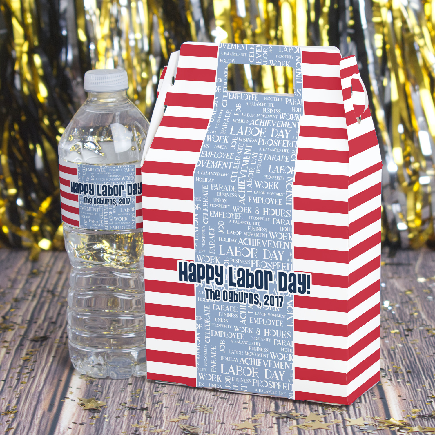 This Labor Design is a fun bright red and a subtle light blue, with white accenting all around. A red and white striped pattern is used, as well as a light blue pattern with a white word cloud on it. The word cloud pattern is a combination of themed words having to do with Labor Day, like "work," "prosperity," and "Labor Day." The red and white striped pattern is used on either side of the word cloud pattern, creating a three-part design.