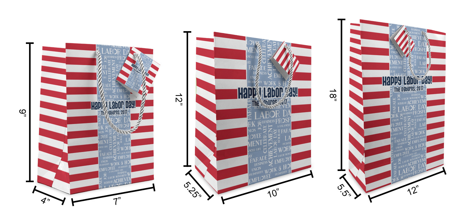 | Size (Varies By Option) | Small Gift Bag (7" x 4" x 9") Medium Gift Bag (10" x 5.25" x 12") Large Gift Bag (12" x 5.5" x 18") |