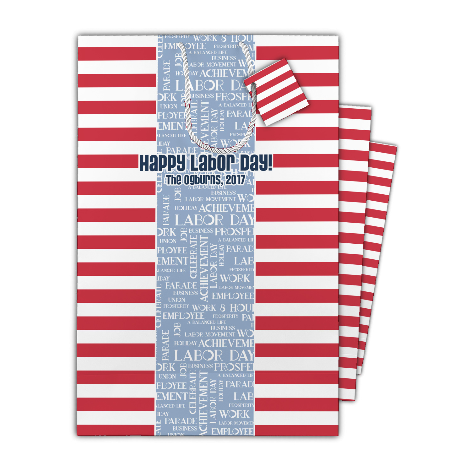 This Labor Design is a fun bright red and a subtle light blue, with white accenting all around. A red and white striped pattern is used, as well as a light blue pattern with a white word cloud on it. The word cloud pattern is a combination of themed words having to do with Labor Day, like "work," "prosperity," and "Labor Day." The red and white striped pattern is used on either side of the word cloud pattern, creating a three-part design.