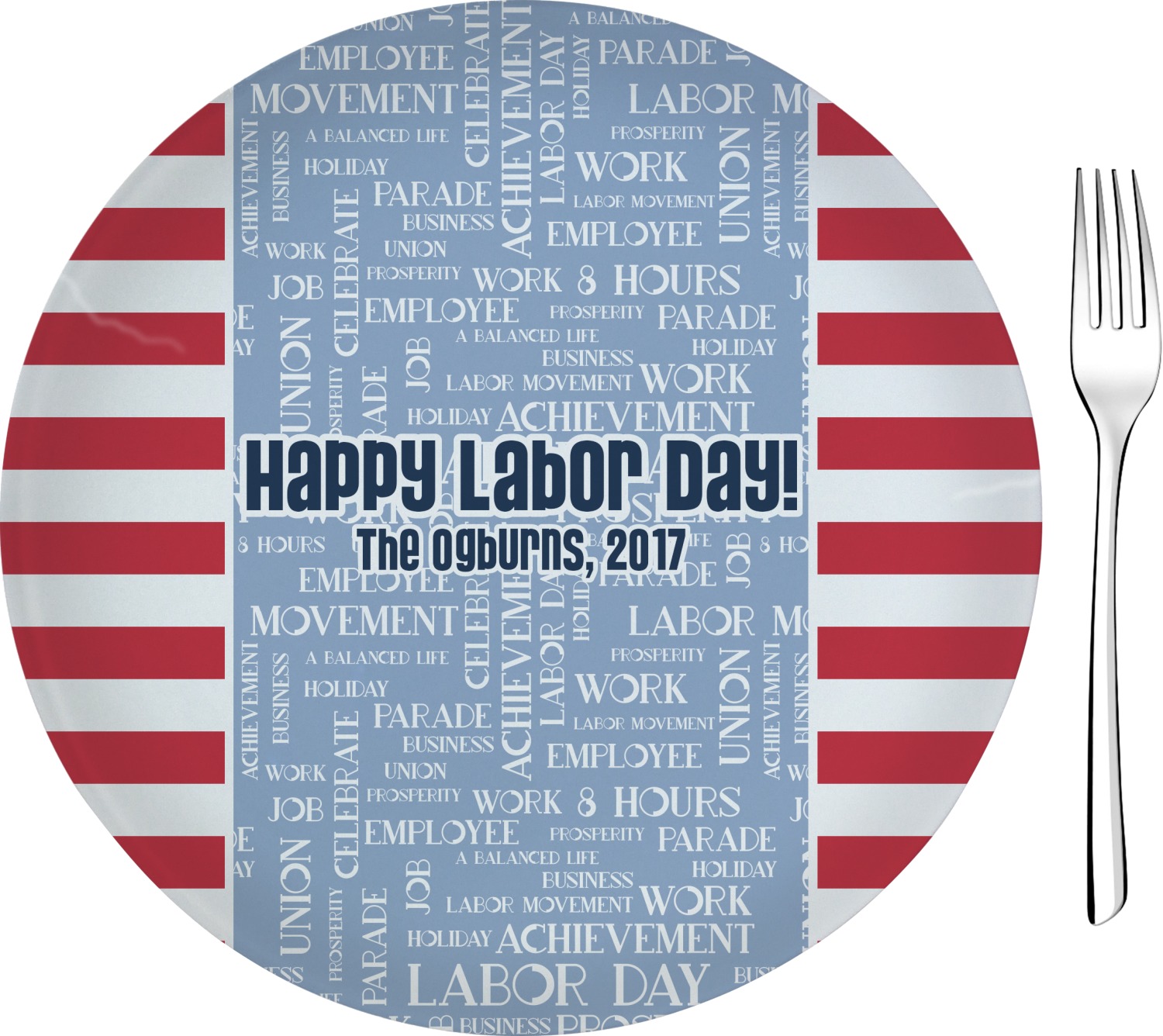 A fun red, white, and blue Labor Day badge is used in the coordinating part of the design. There are two different kinds of fonts used. One in the word cloud and one used in the personalization.