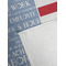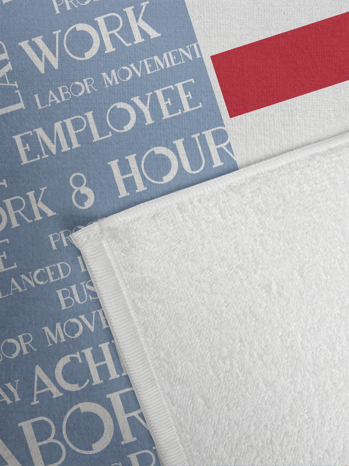 This Labor Design is a fun bright red and a subtle light blue, with white accenting all around. A red and white striped pattern is used, as well as a light blue pattern with a white word cloud on it. The word cloud pattern is a combination of themed words having to do with Labor Day, like "work," "prosperity," and "Labor Day." The red and white striped pattern is used on either side of the word cloud pattern, creating a three-part design.